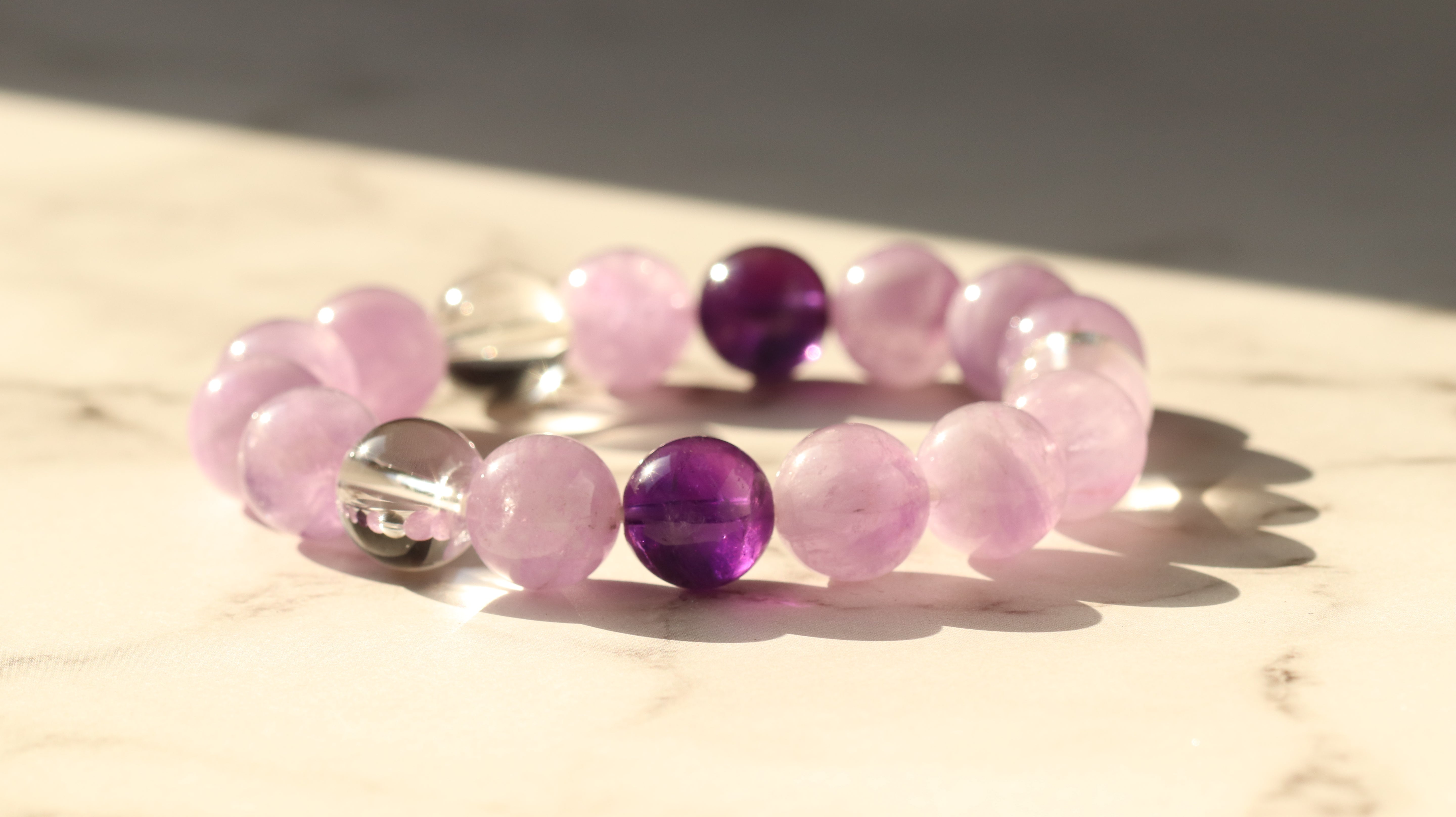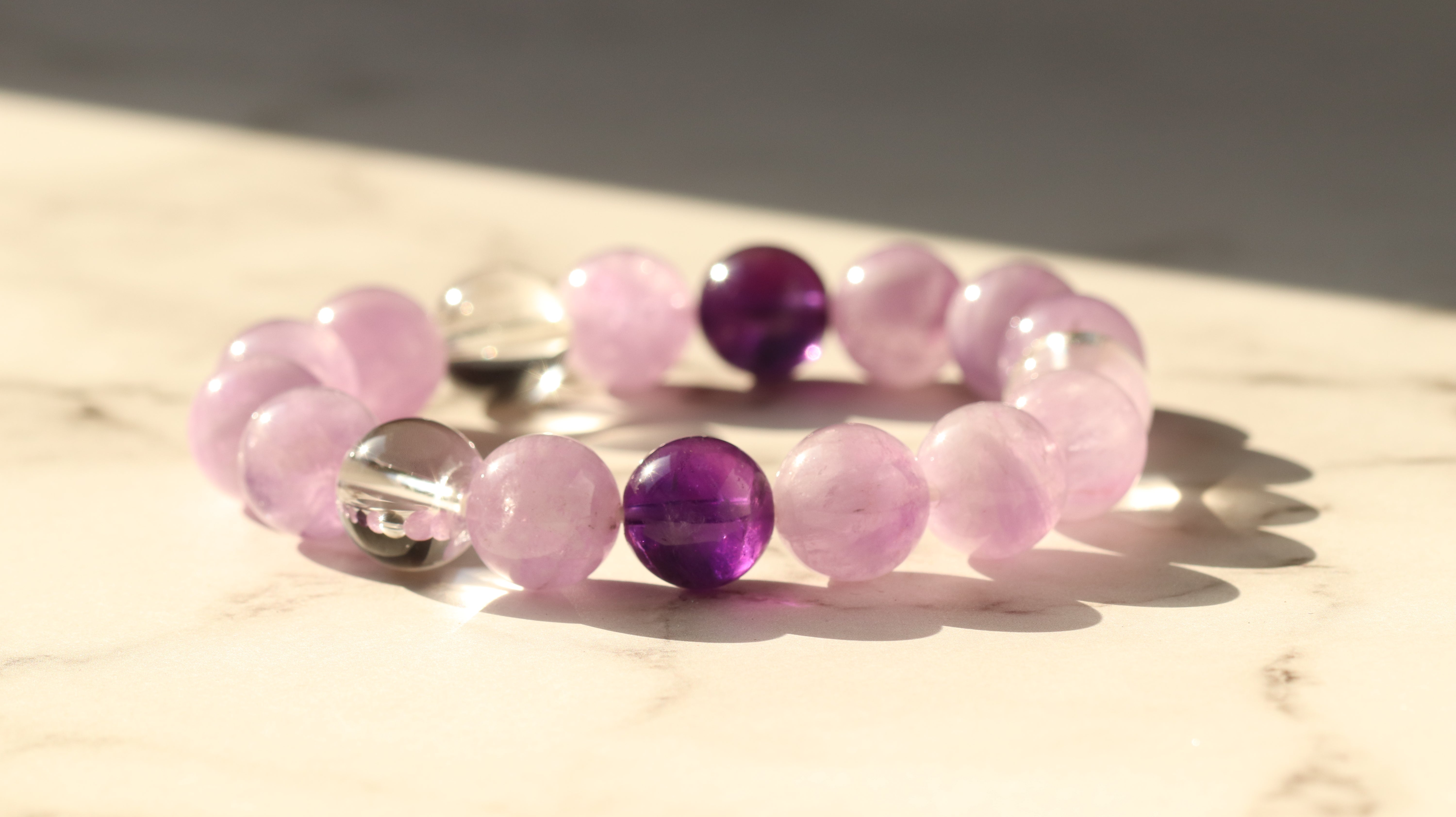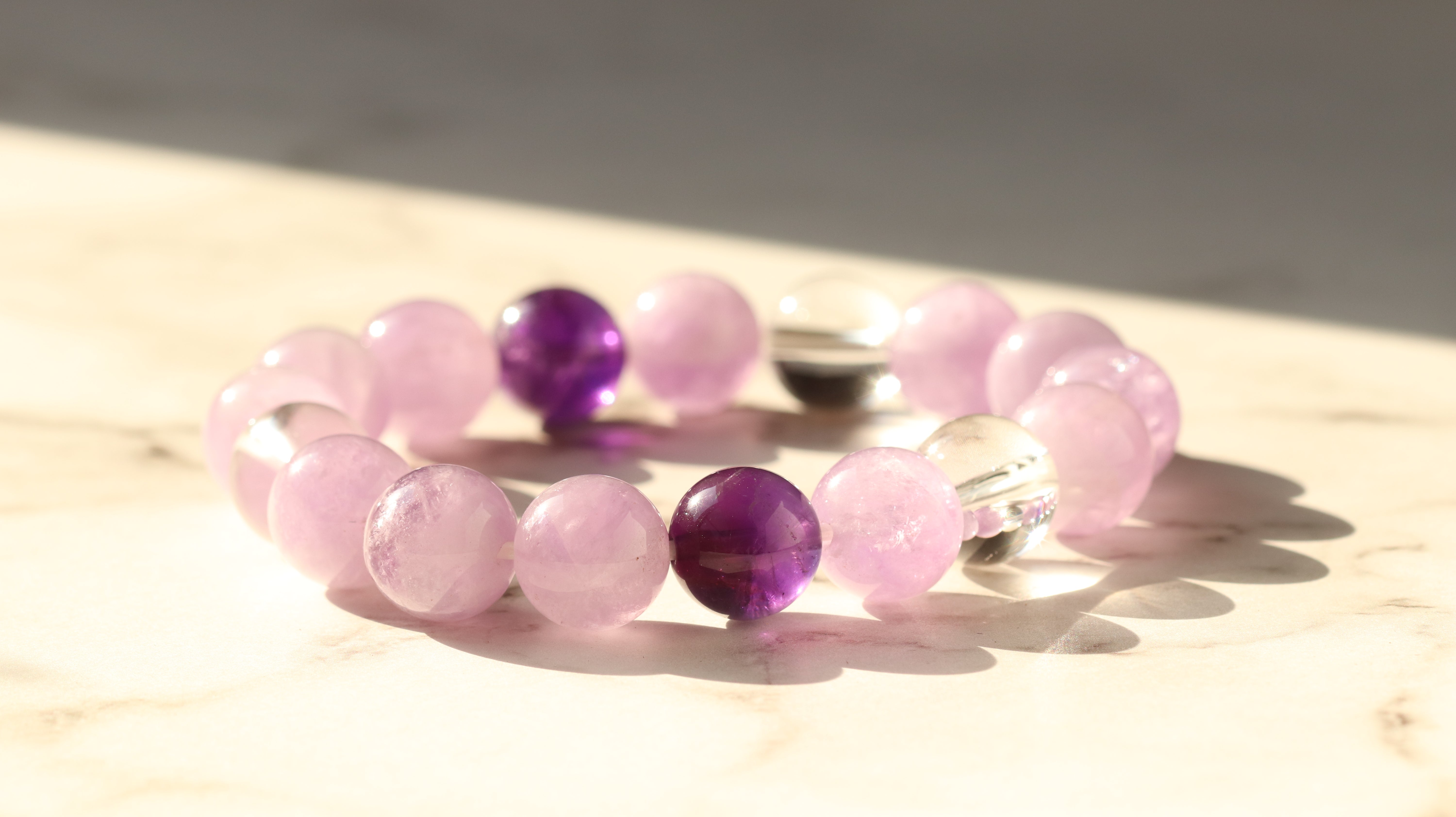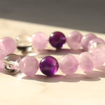 2月の誕生石・アメジストに、淡いラベンダーアメジストと天然水晶をあわせた上品なブレスレット。紫の濃淡と透明な輝きが重なり合い、まるで冬から春へと移ろう空気のような静かな光のグラデーションブレスレットです。