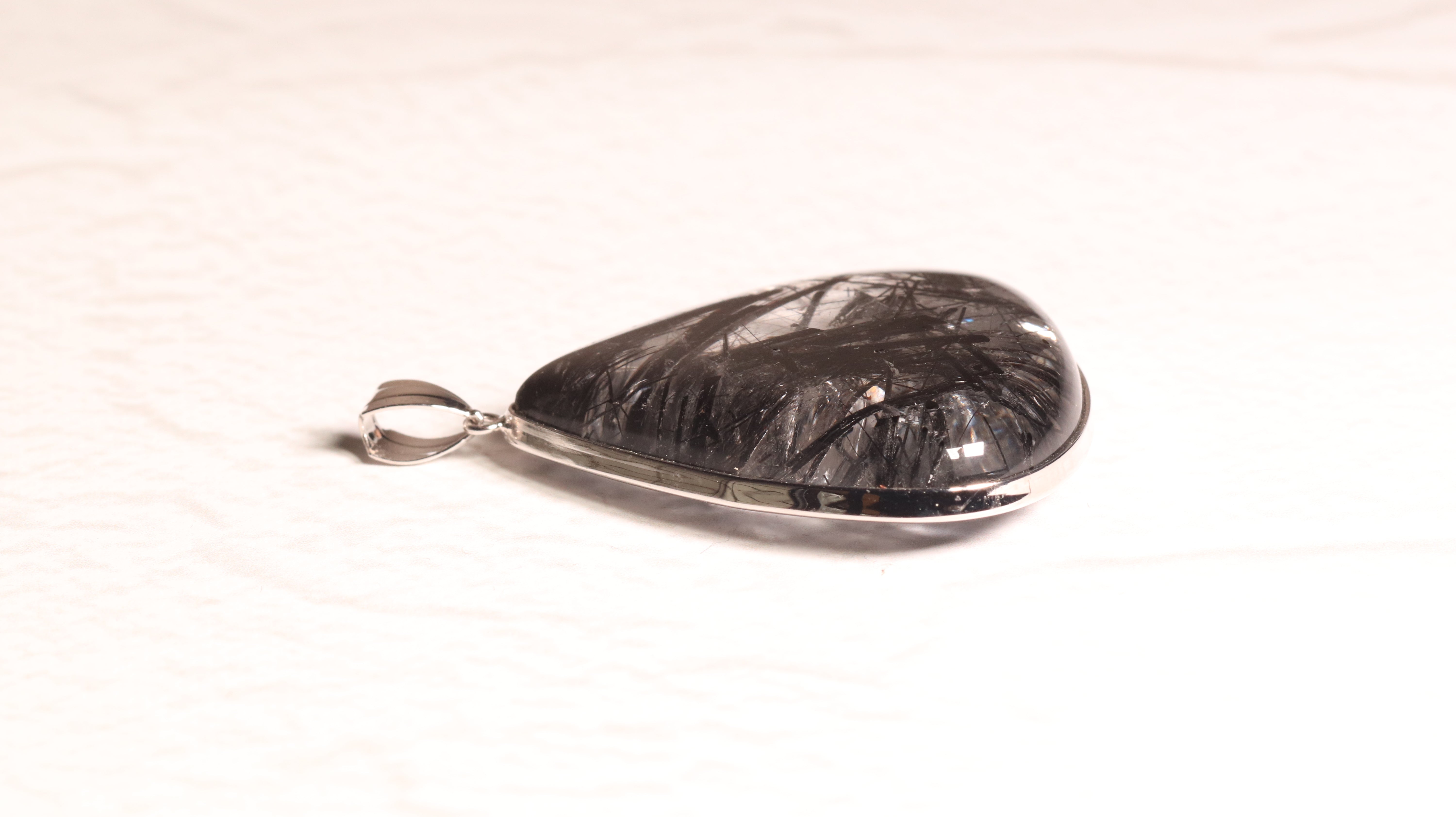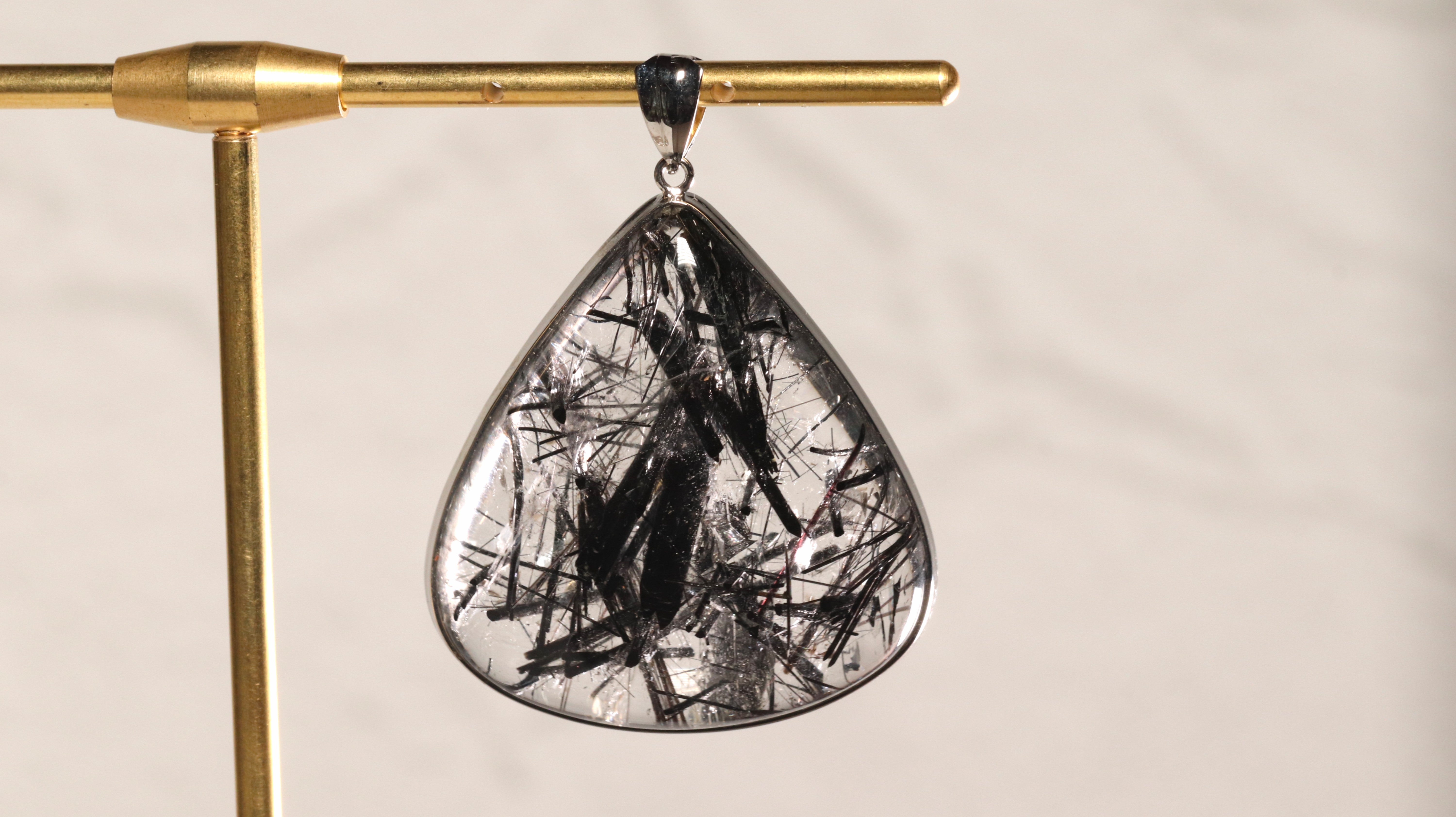 重くなりがちな黒いペンダントに、クリスタルの透明感が程よい軽やかさをもたらしてくれます。クリスタルのクラックに光が反射してうまれる一瞬のきらめきもまた魅力的です。