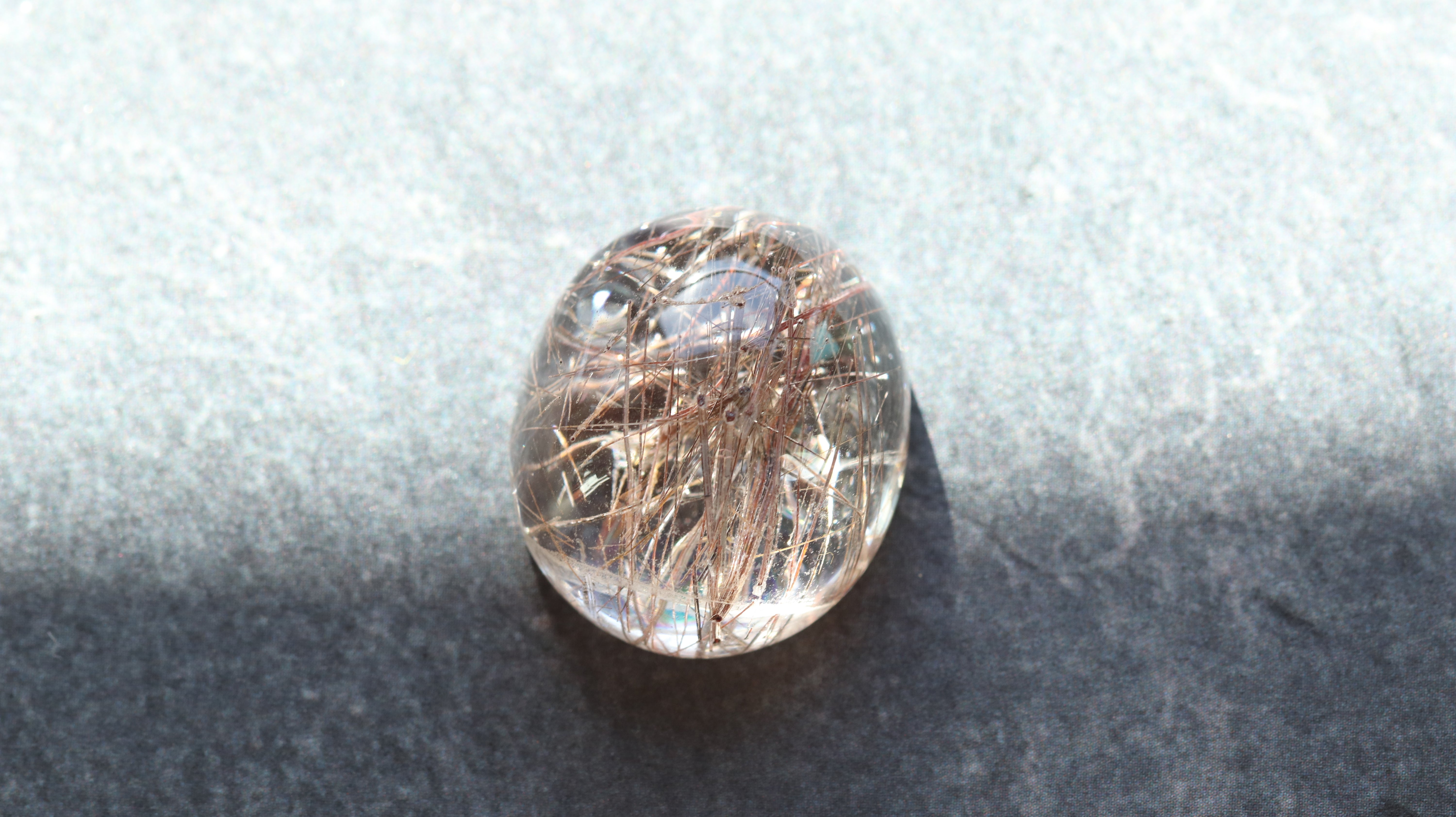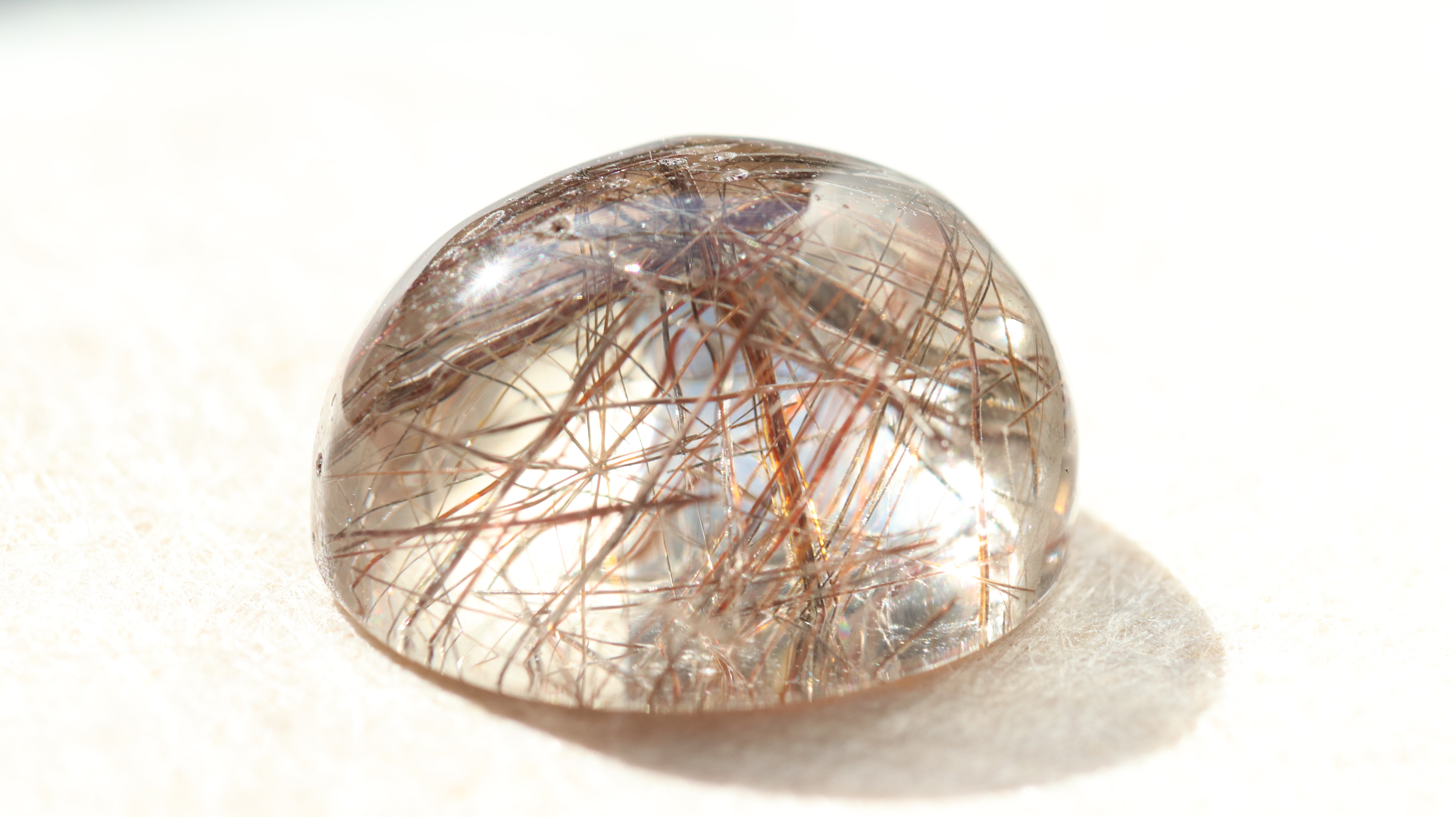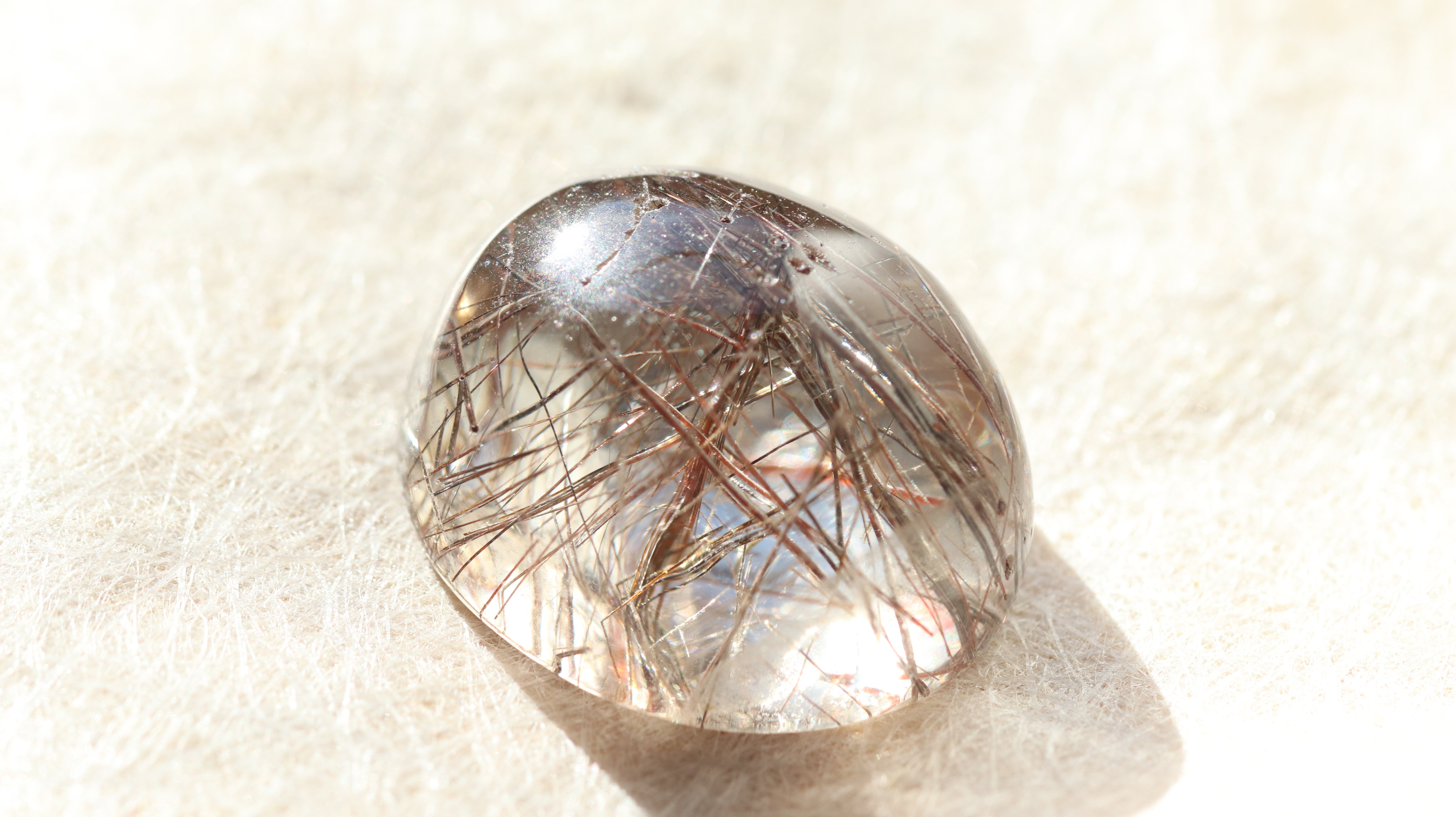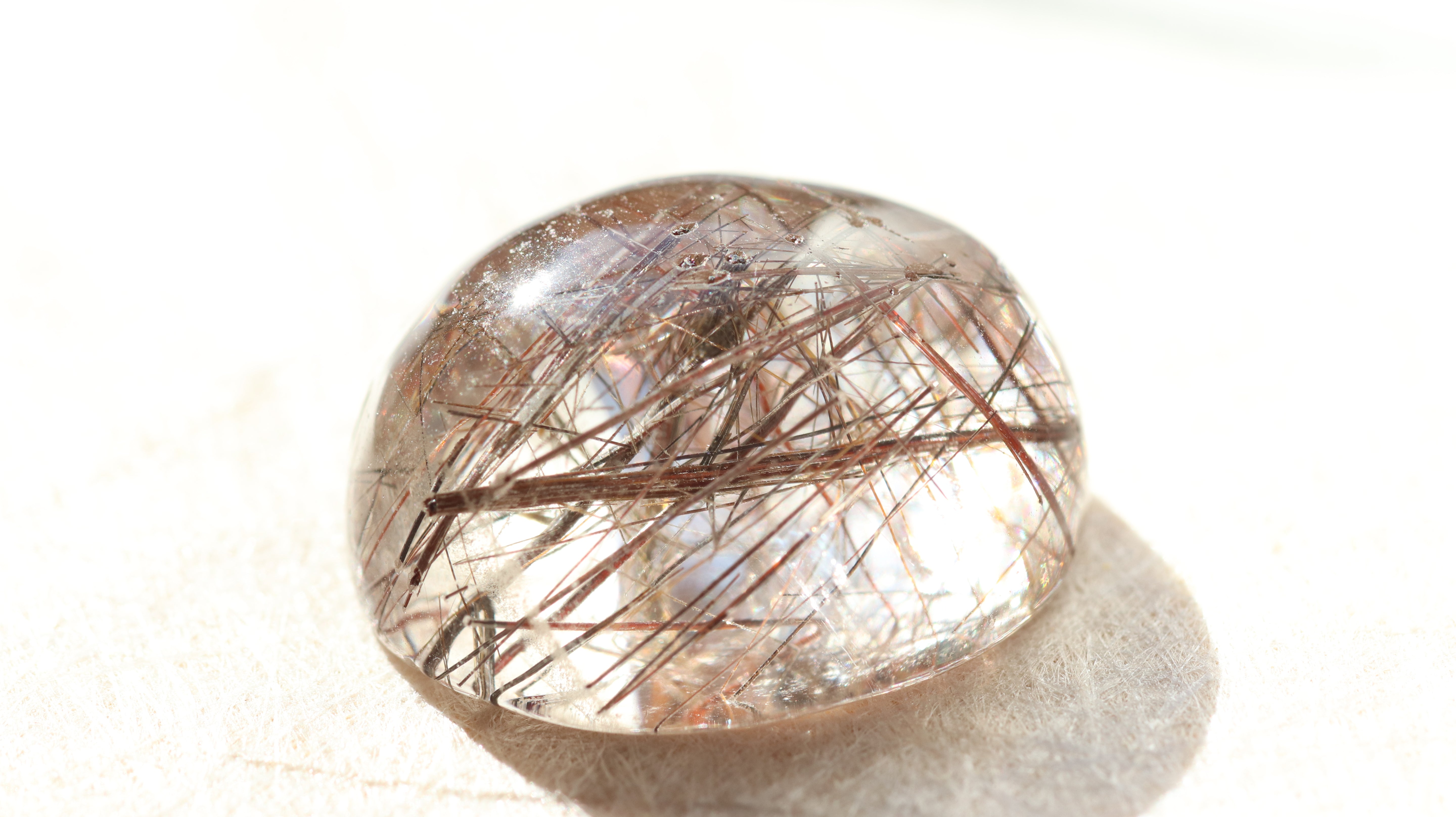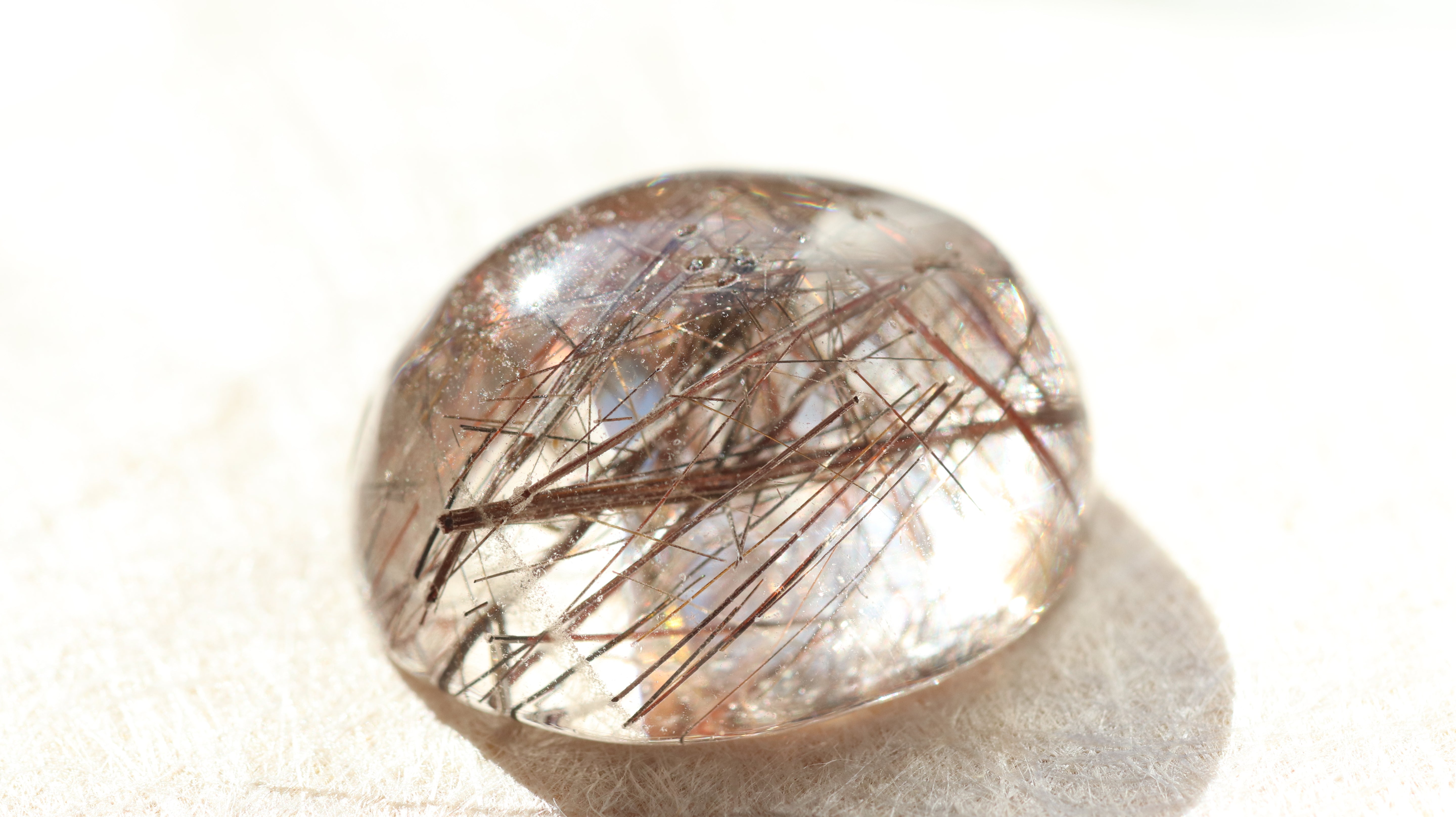 柔らかなコロンとしたフォルムが光を包み込み、ルチルの一本一本が美しく浮かび上がります。