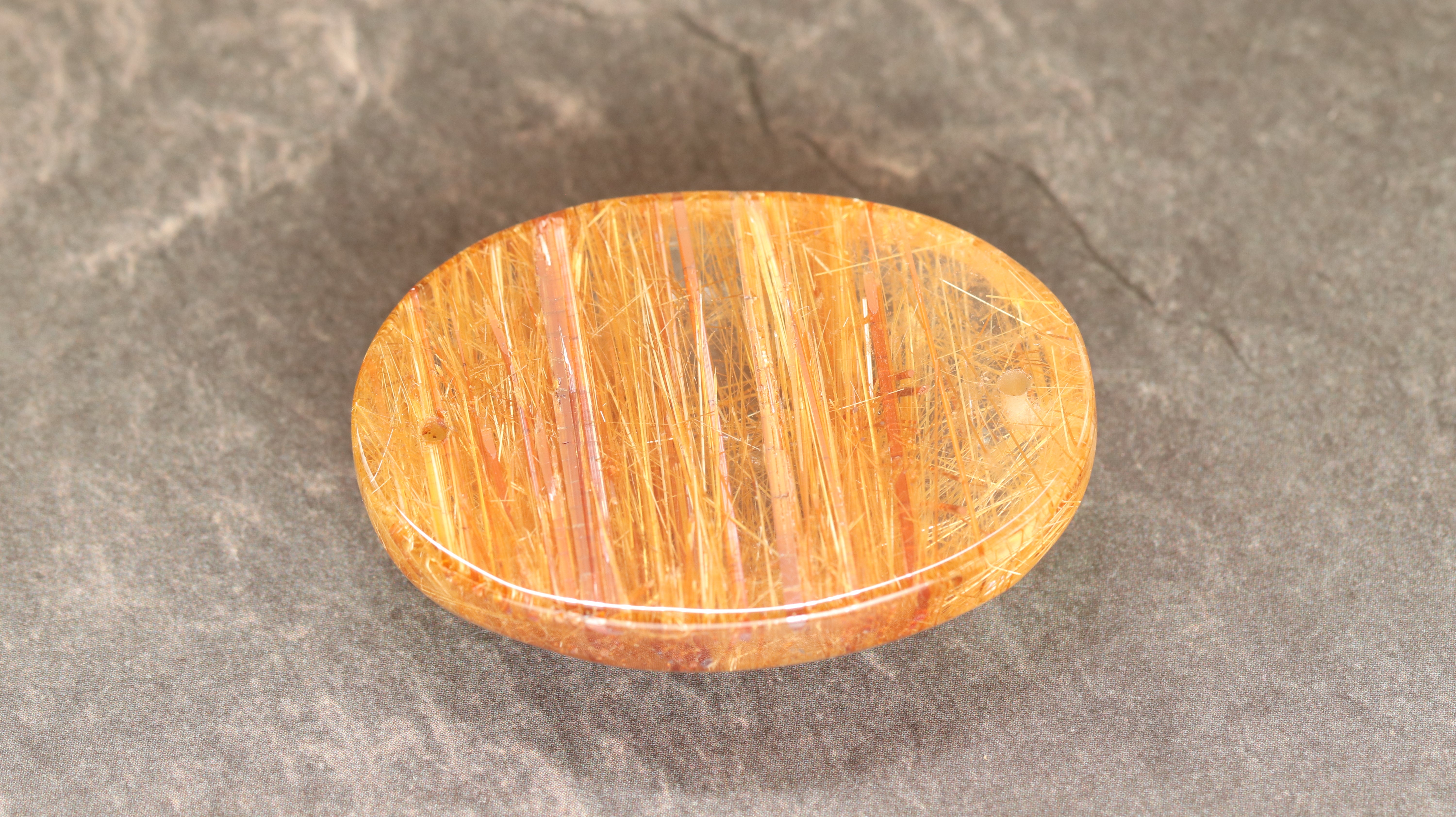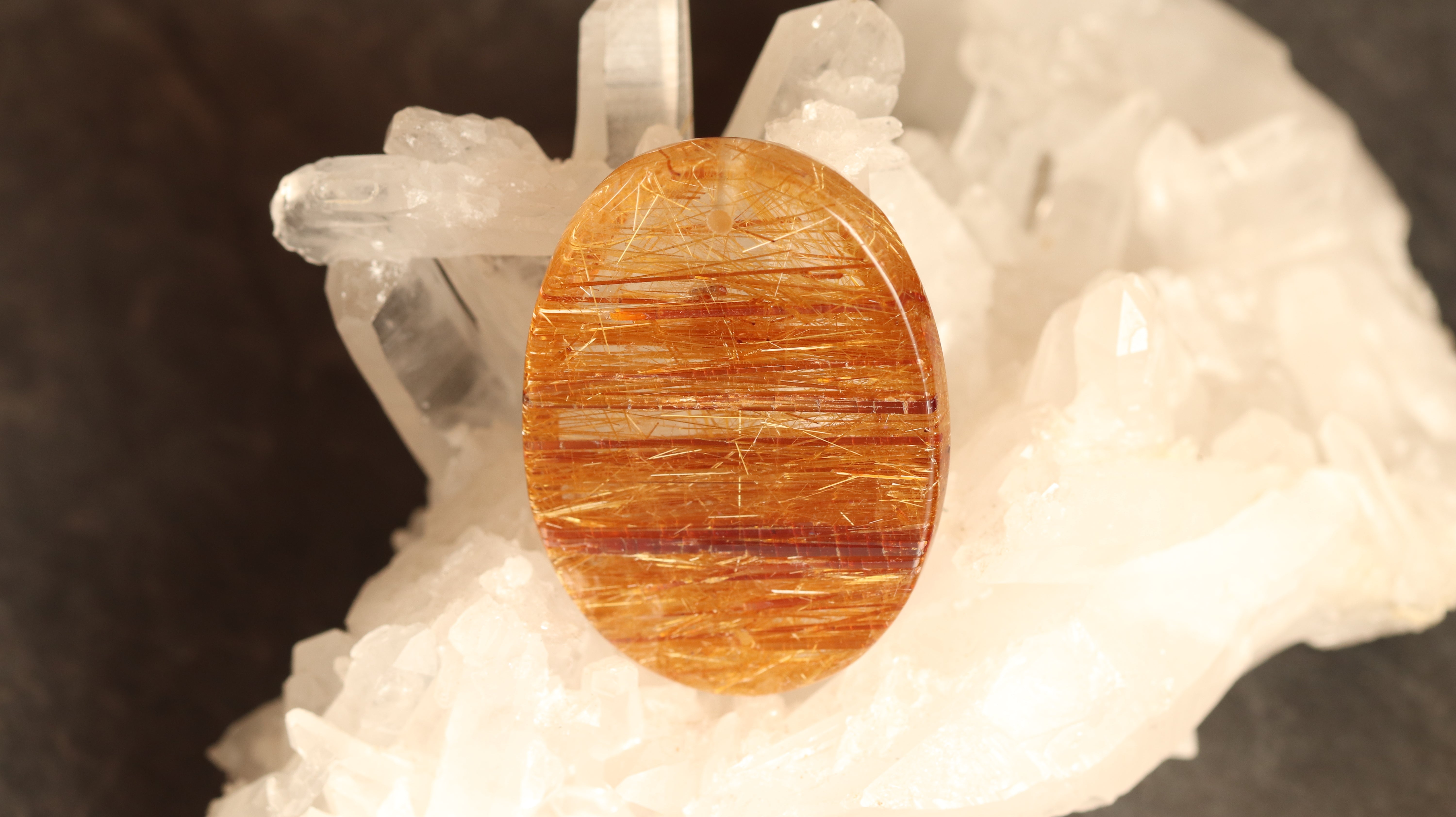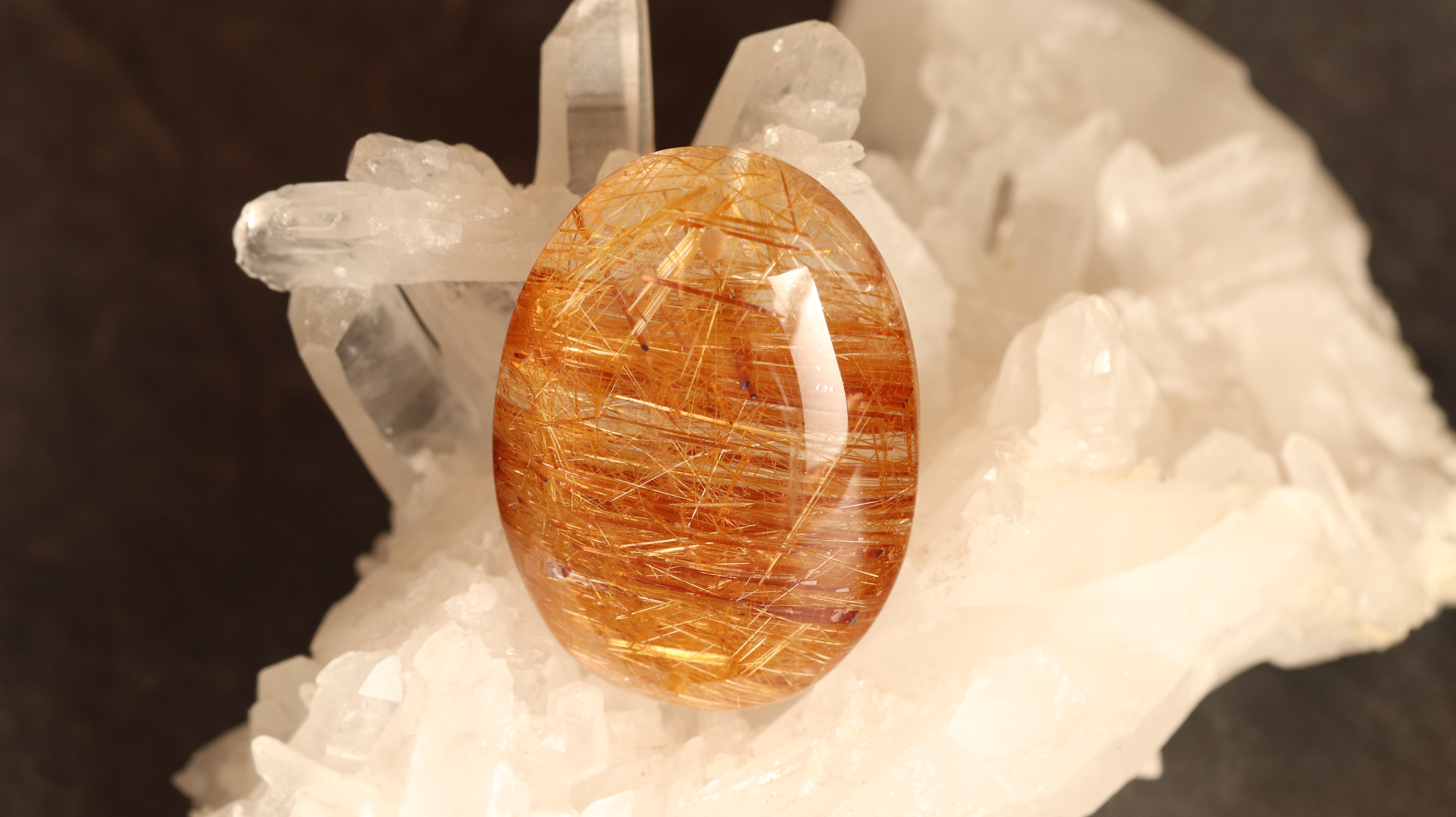 透明度の高いクォーツの中に、しっかりとした存在感を放つブラウンゴールドのルチルが堂々と伸びる上質なルースです。