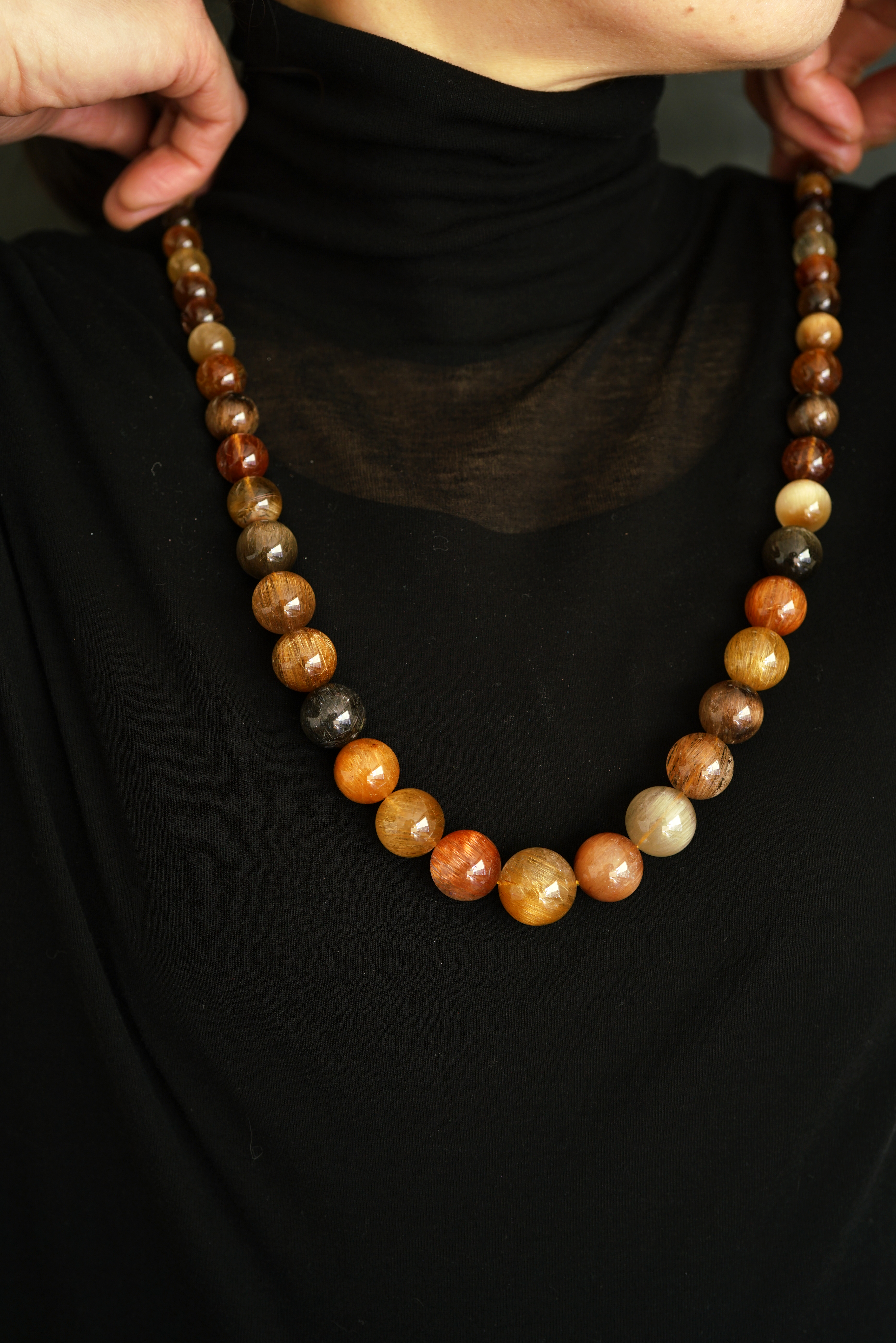 ゴールドルチル、レッドルチル、グリーンルチル、ブラックルチルの一粒一粒がキャッツアイの輝きを放ち、一粒でも価値の高いピースを集めておつくりしました。