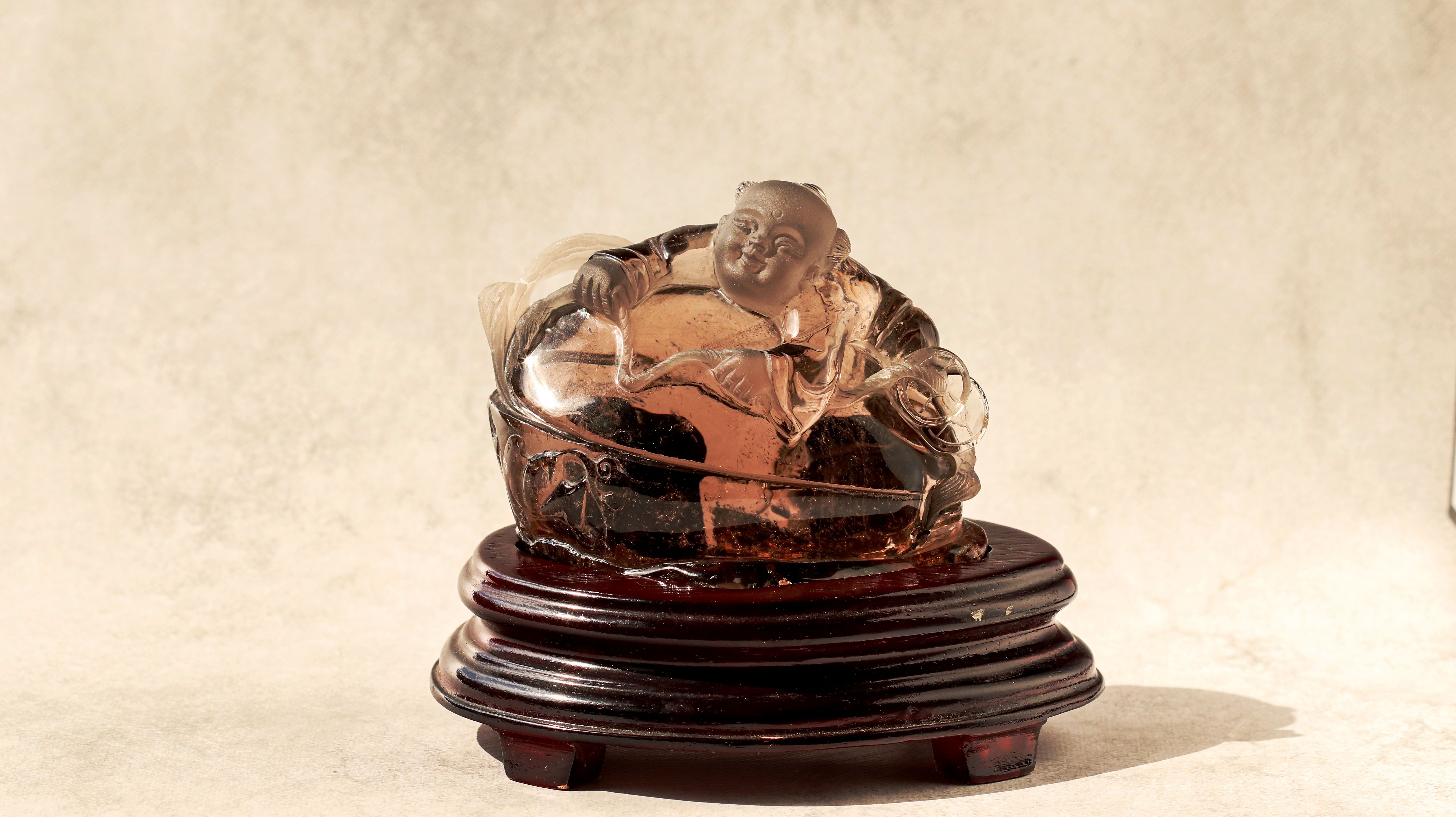 次回は茶水晶彫刻のご紹介です。愛らしい福童子、繊細な彫刻が魅力の商品です。