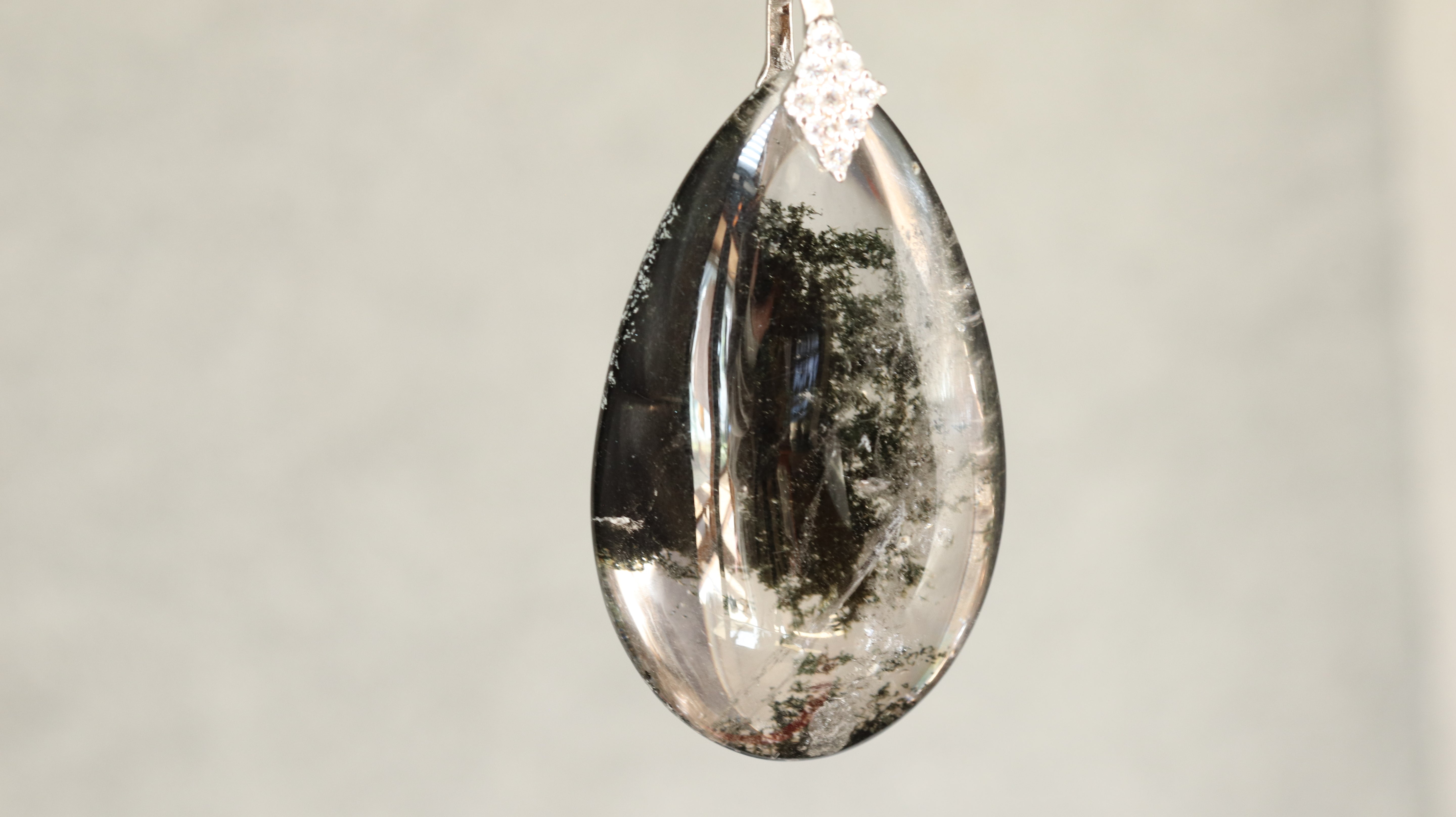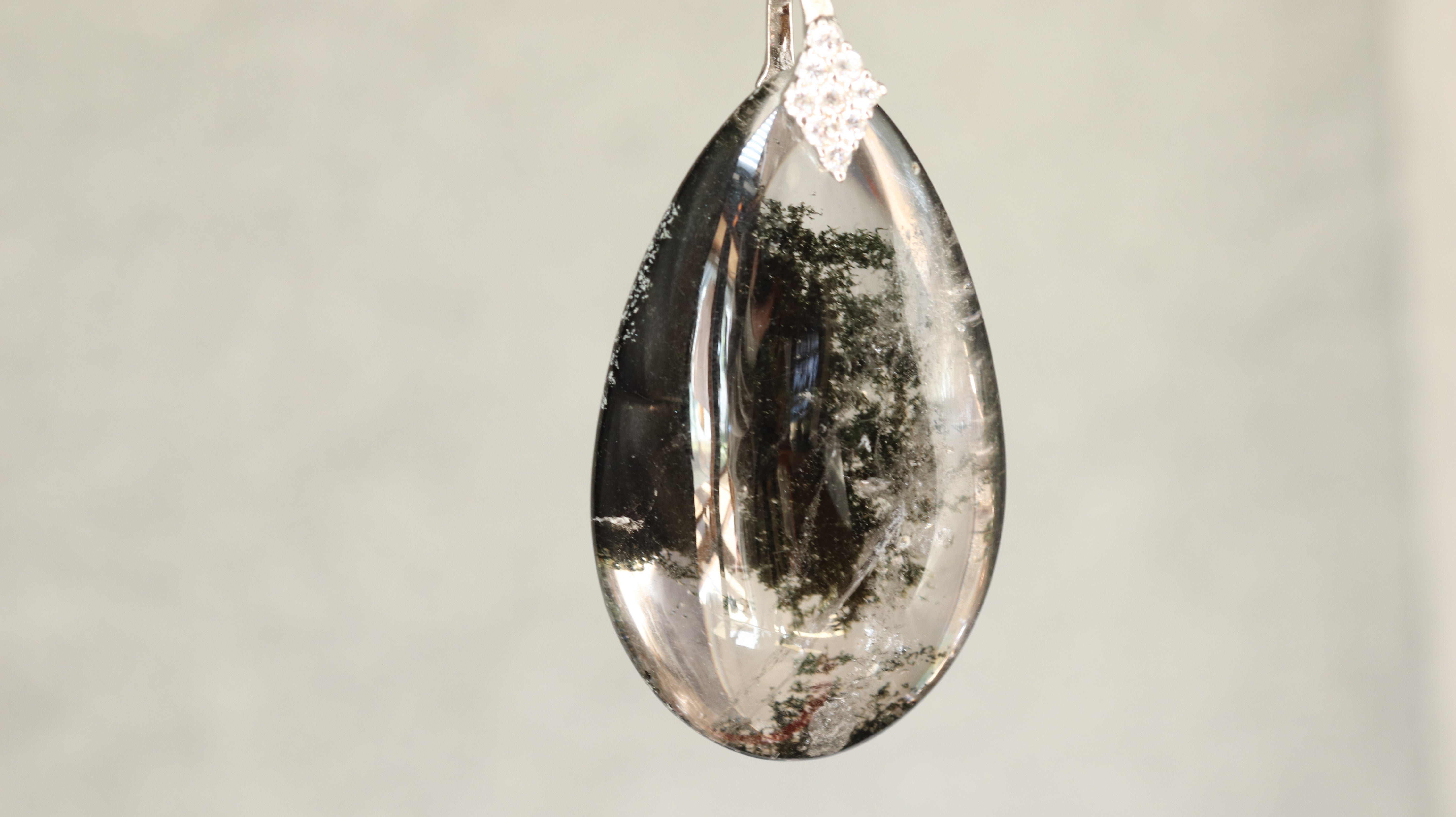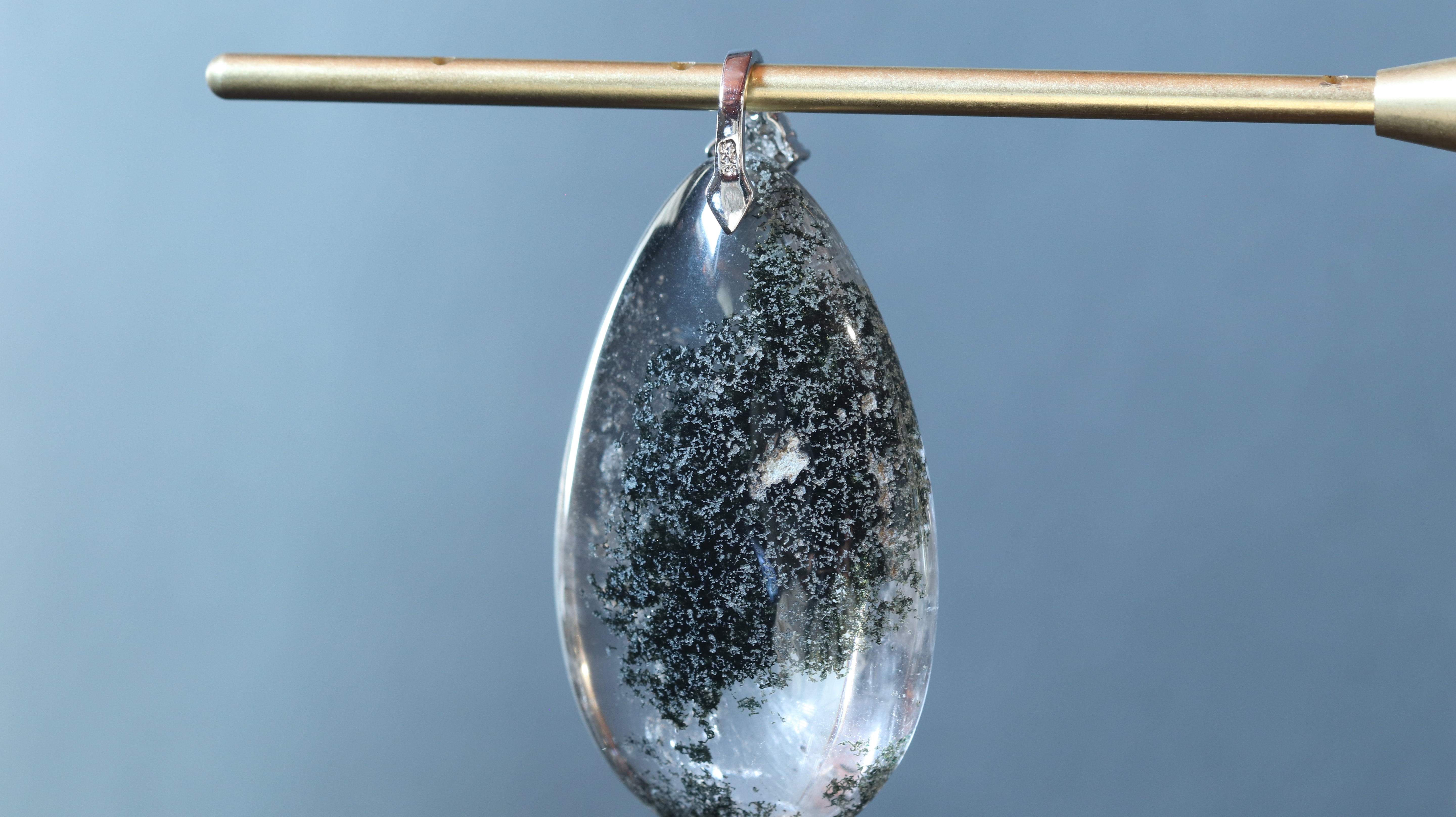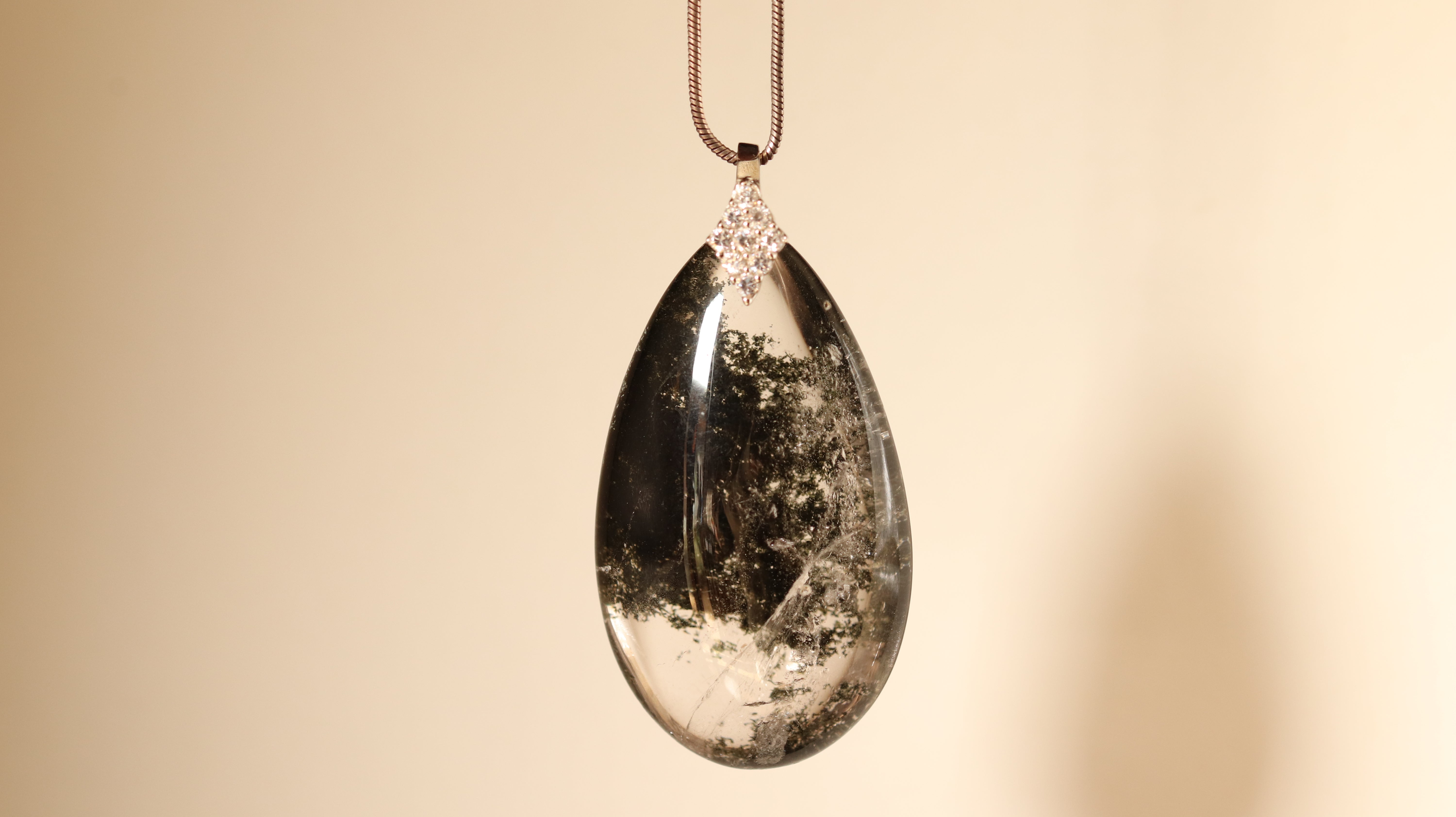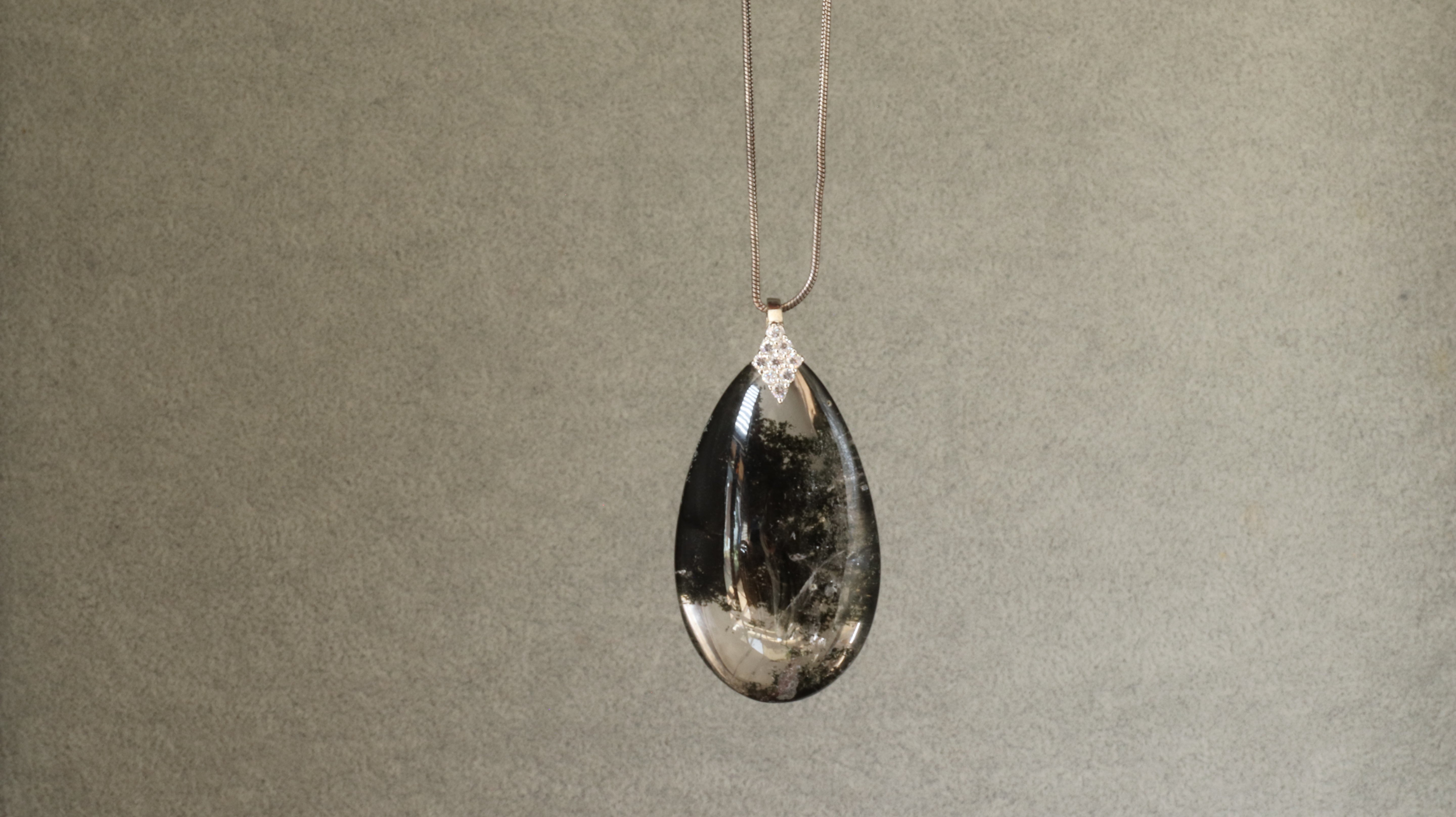インクルージョンが分かりやすいように白い背景で撮影していますが、黒っぽい服装にも陰影が美しく映えるペンダントです。