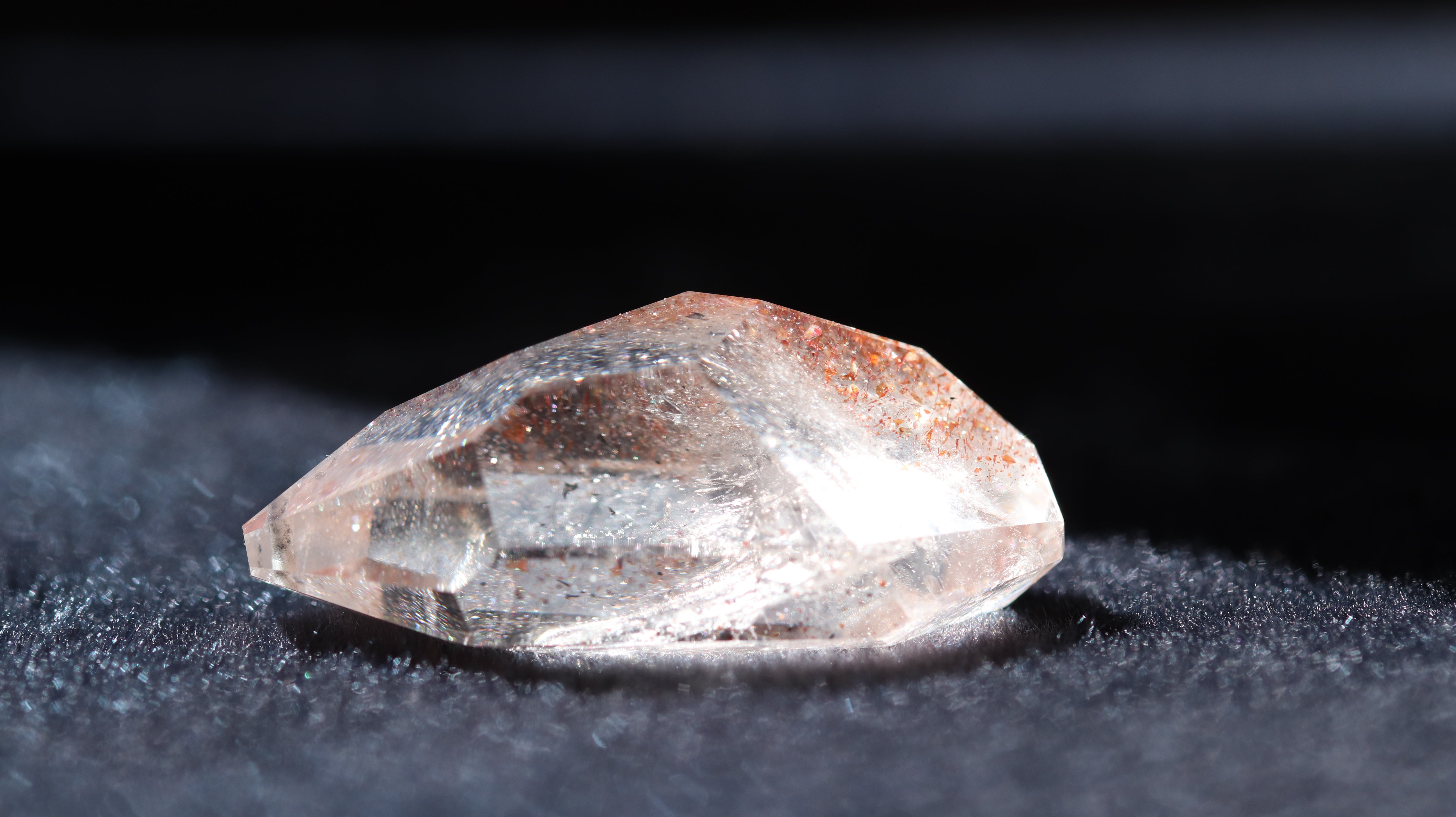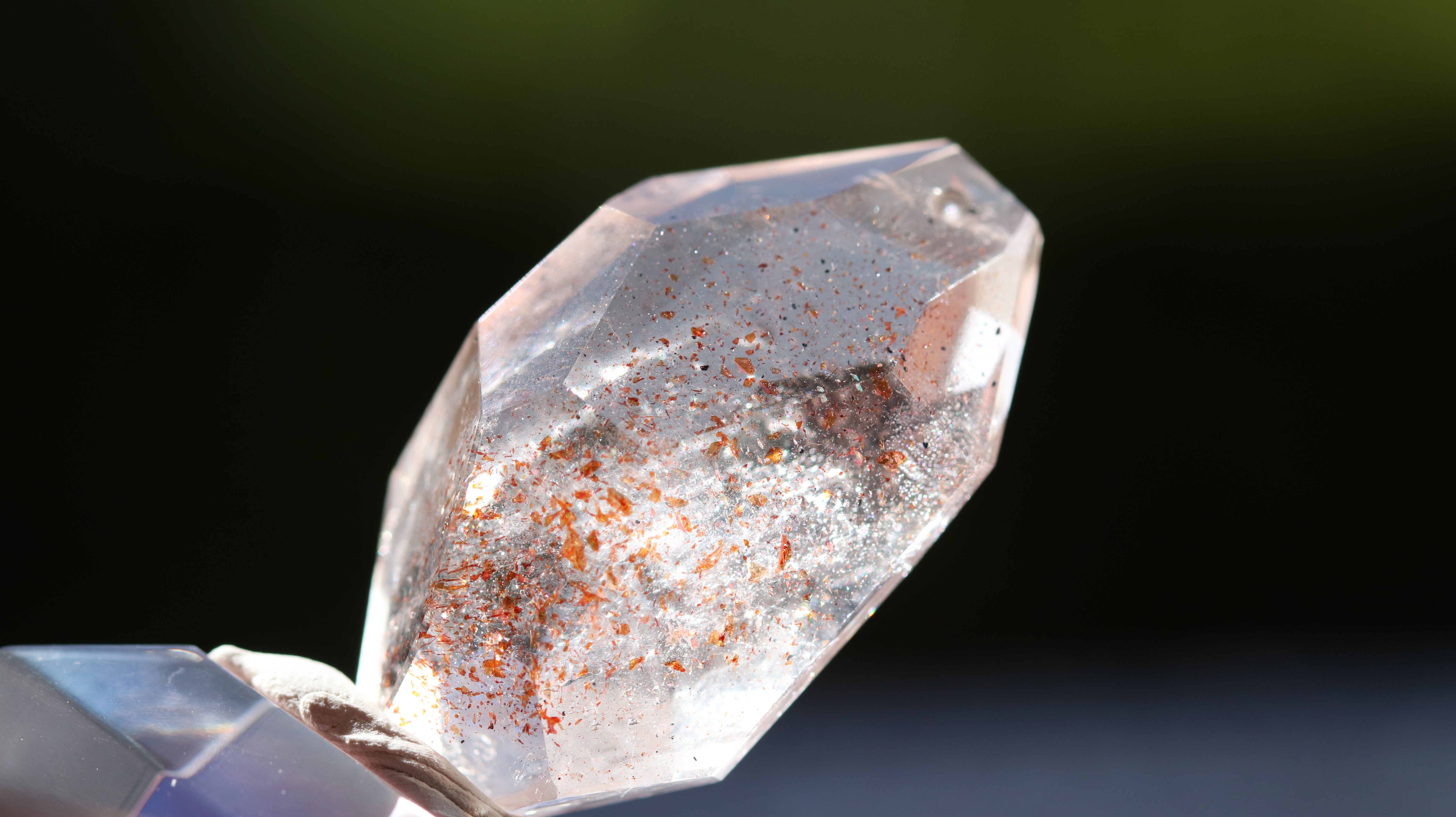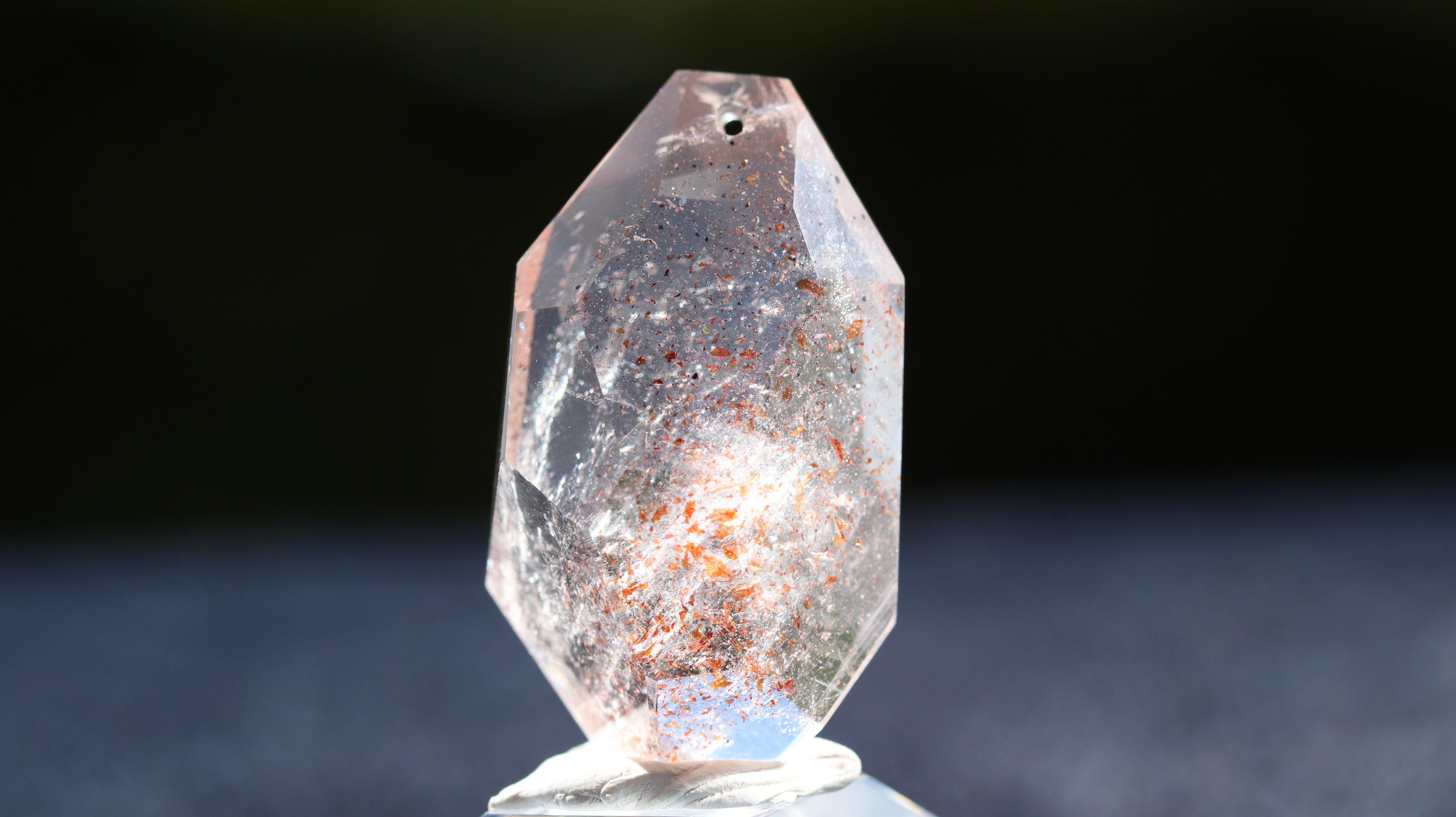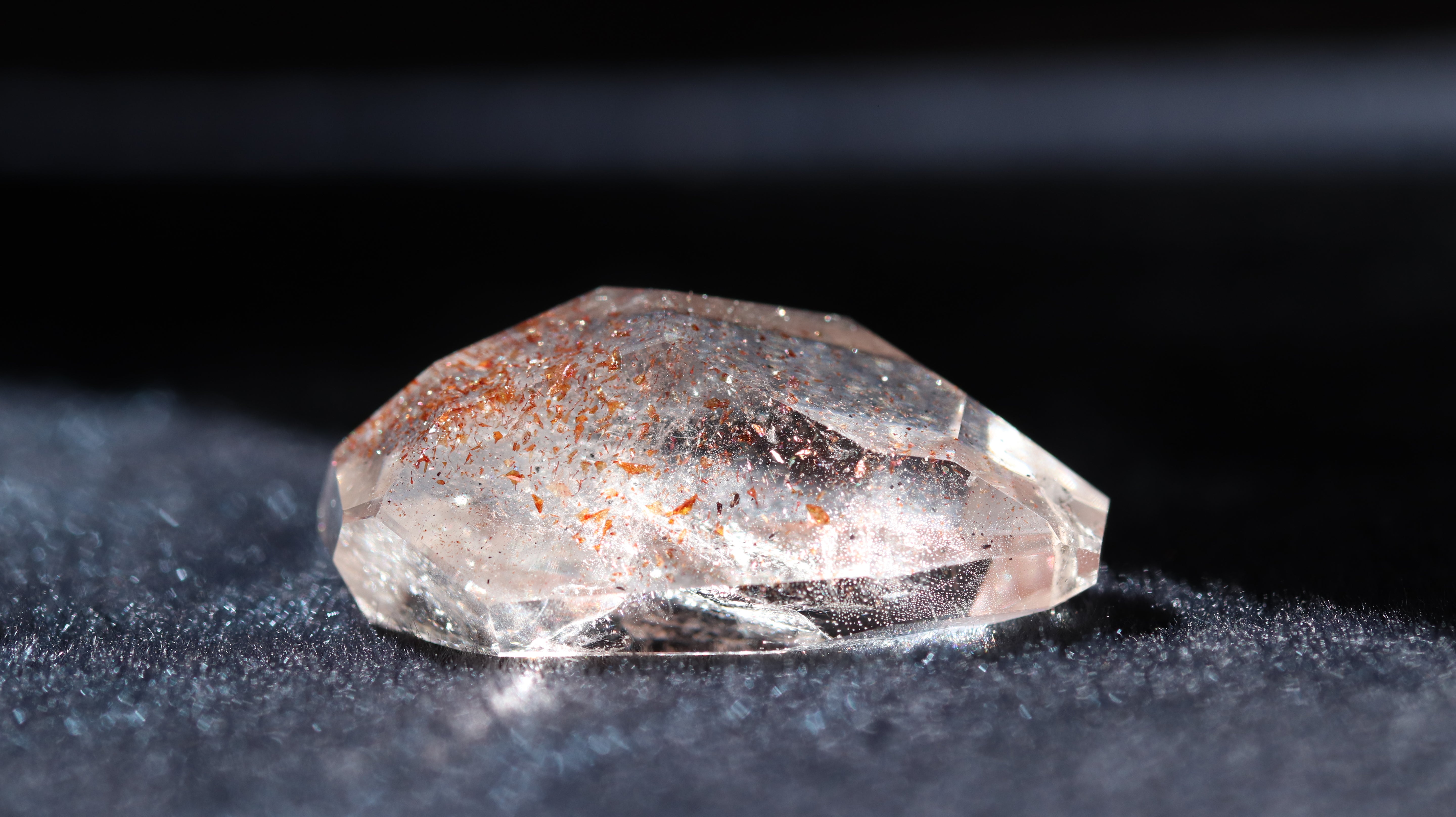 光を透過させると、多面カットの効果と相まって内部の赤い内包物が反射し、角度ごとに異なるきらめきを観察できます。