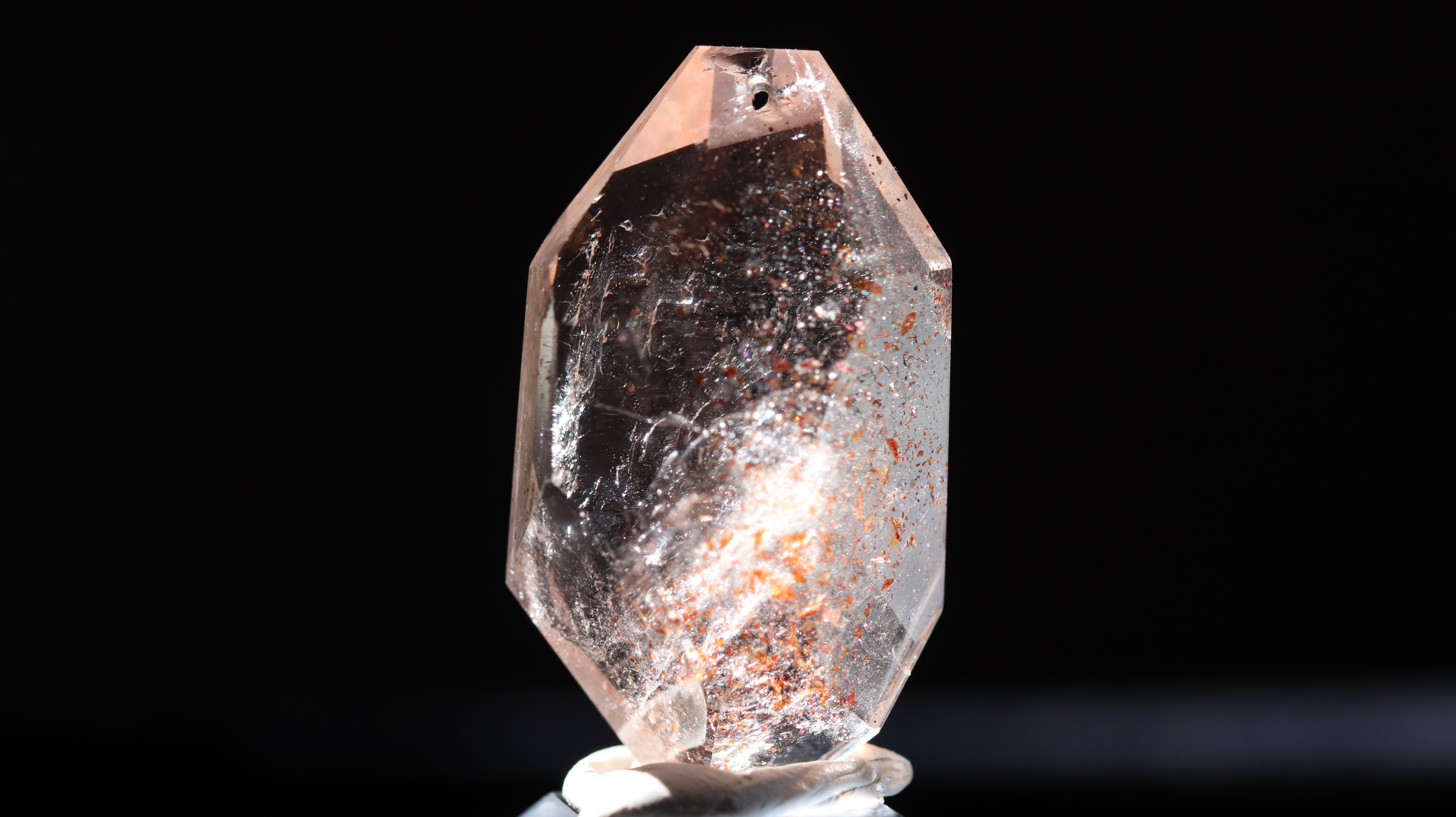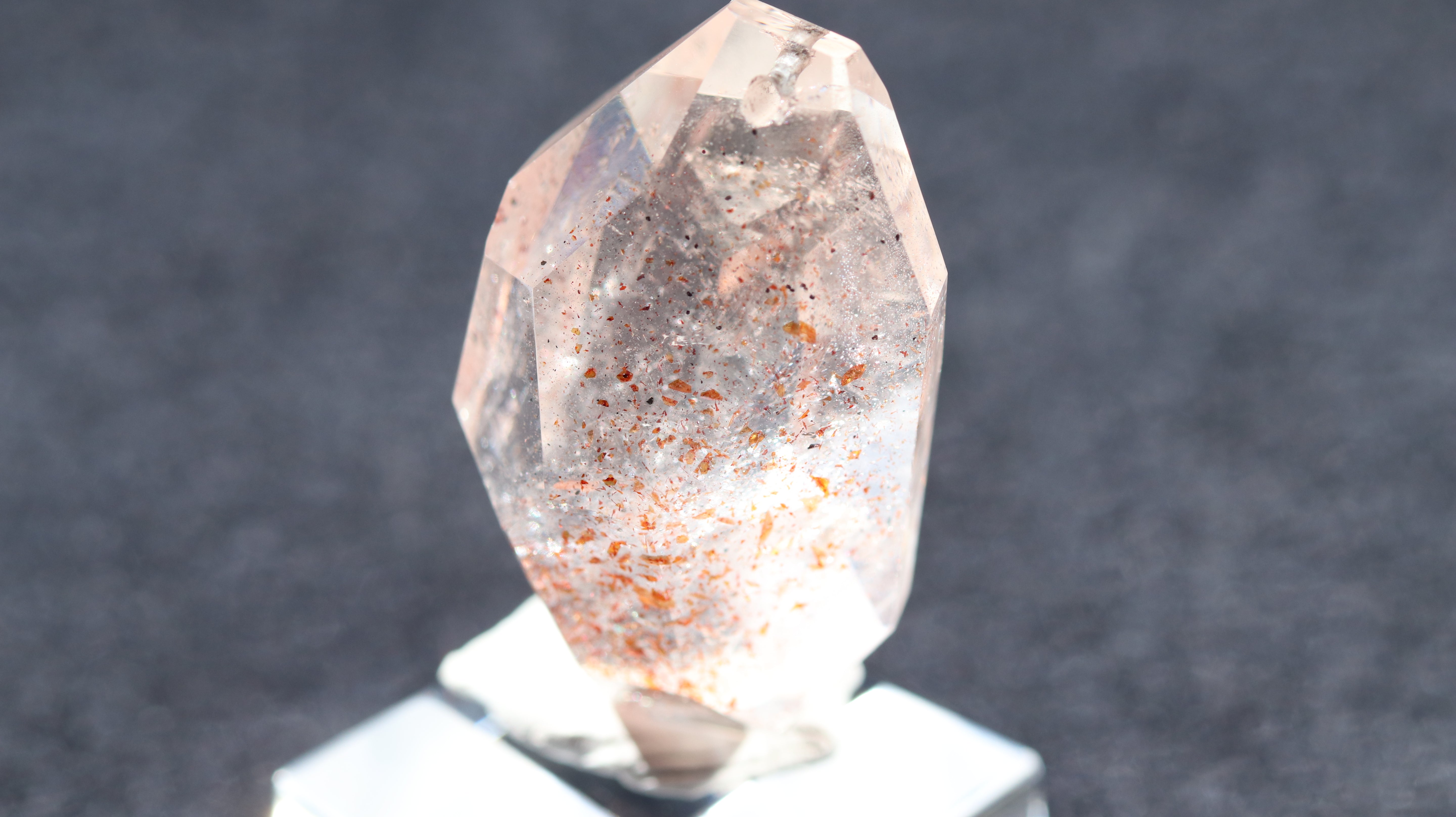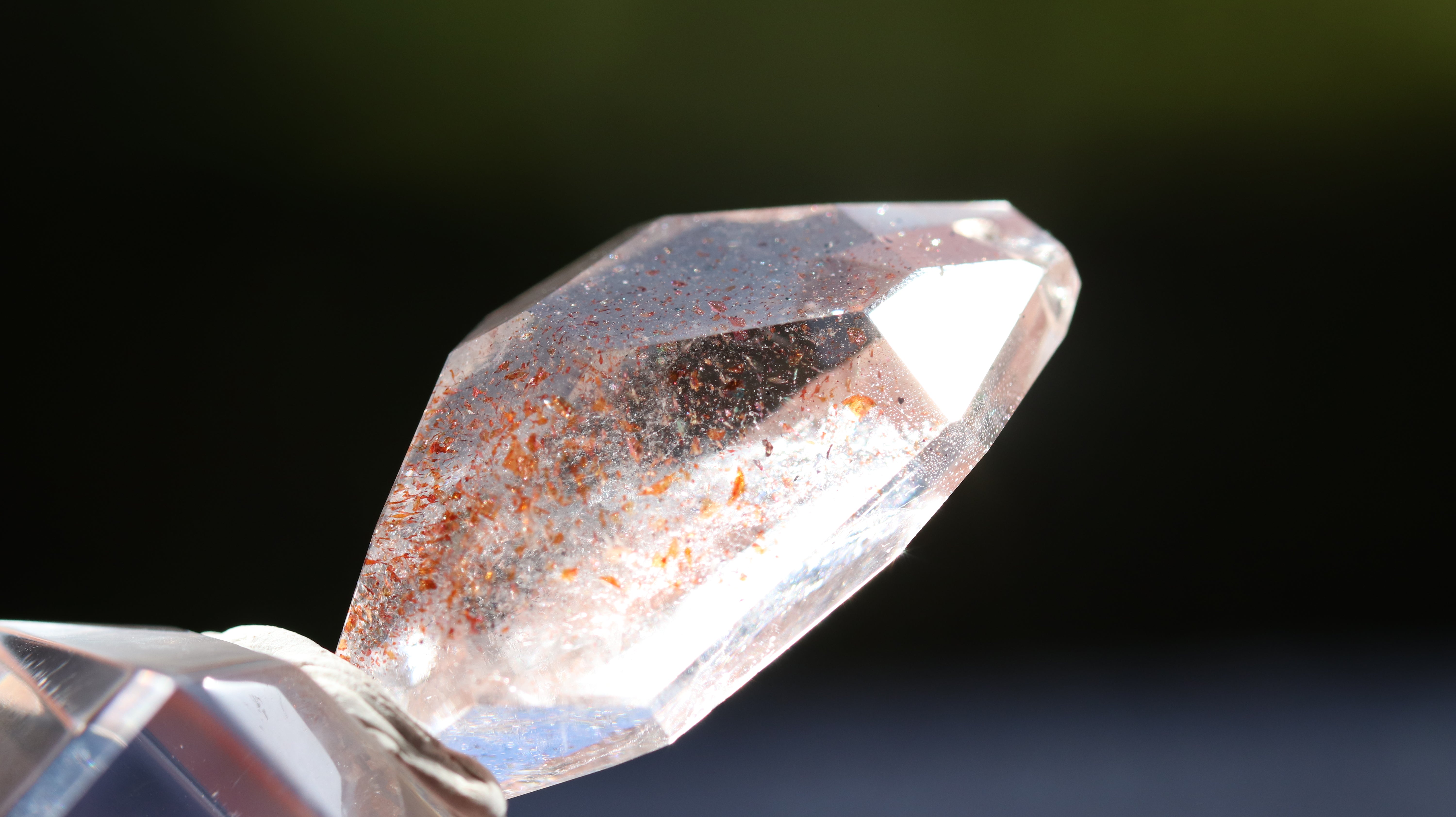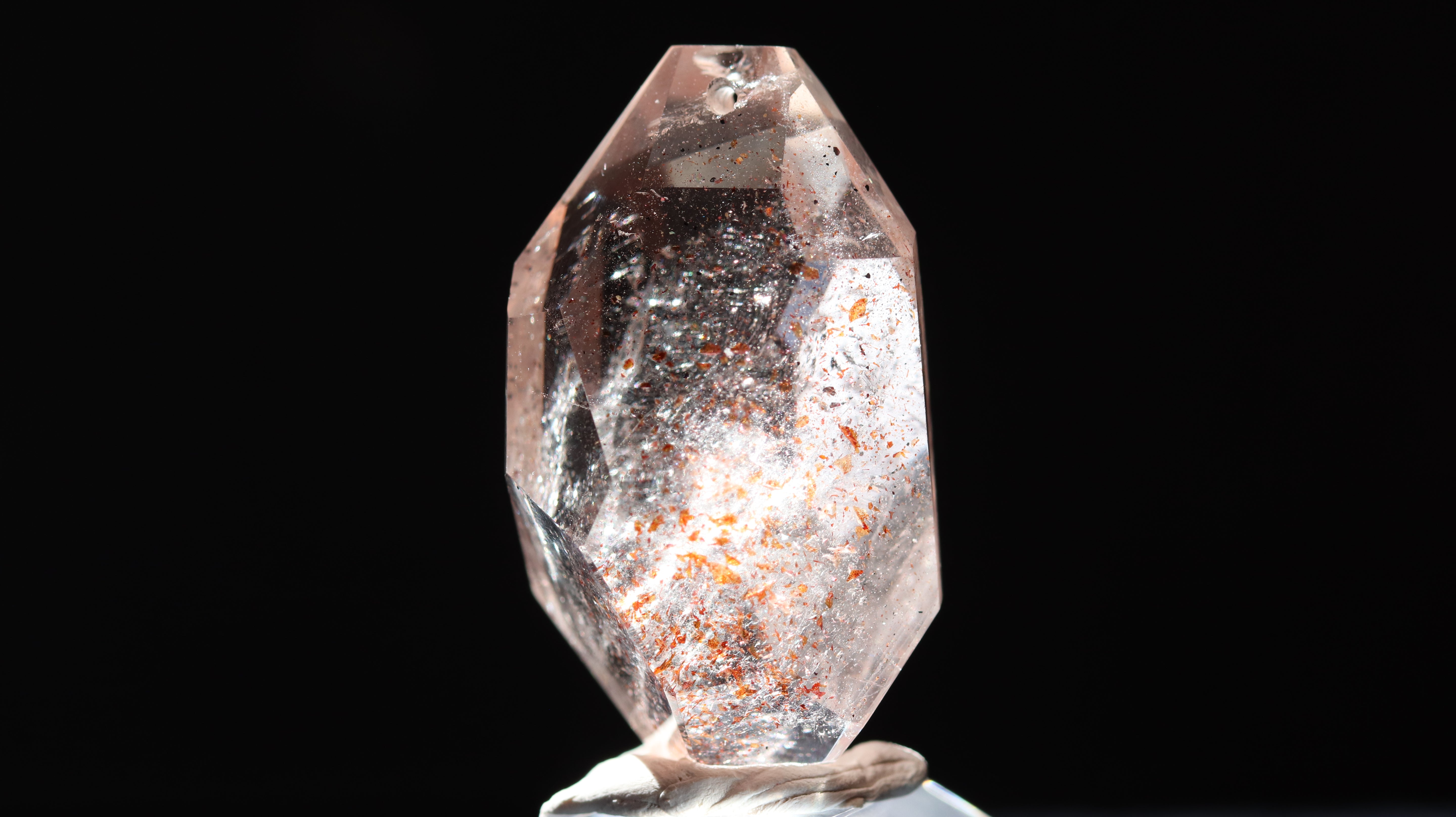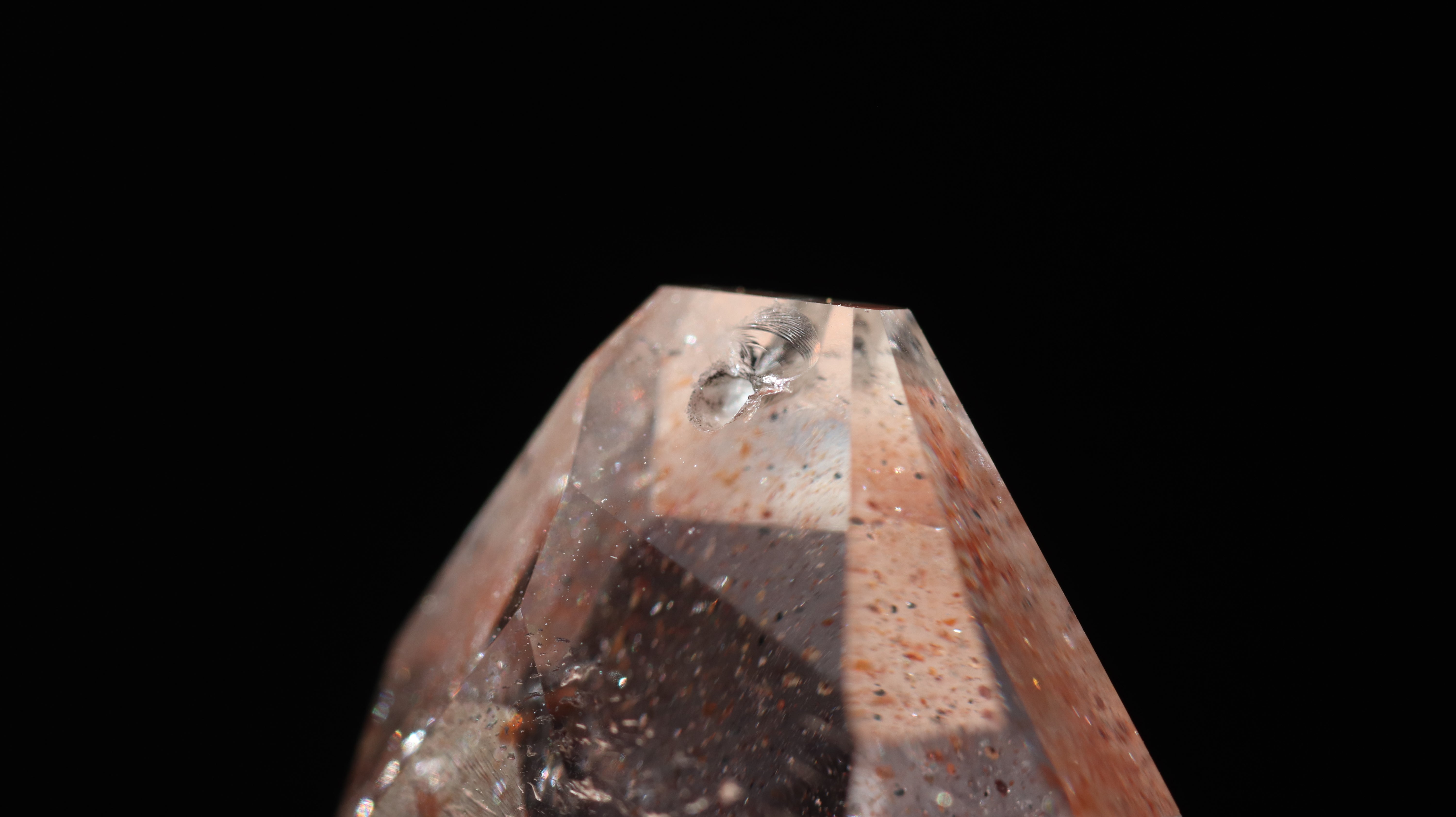 光を透過させると、多面カットの効果と相まって内部の赤い内包物が反射し、角度ごとに異なるきらめきを観察できます。