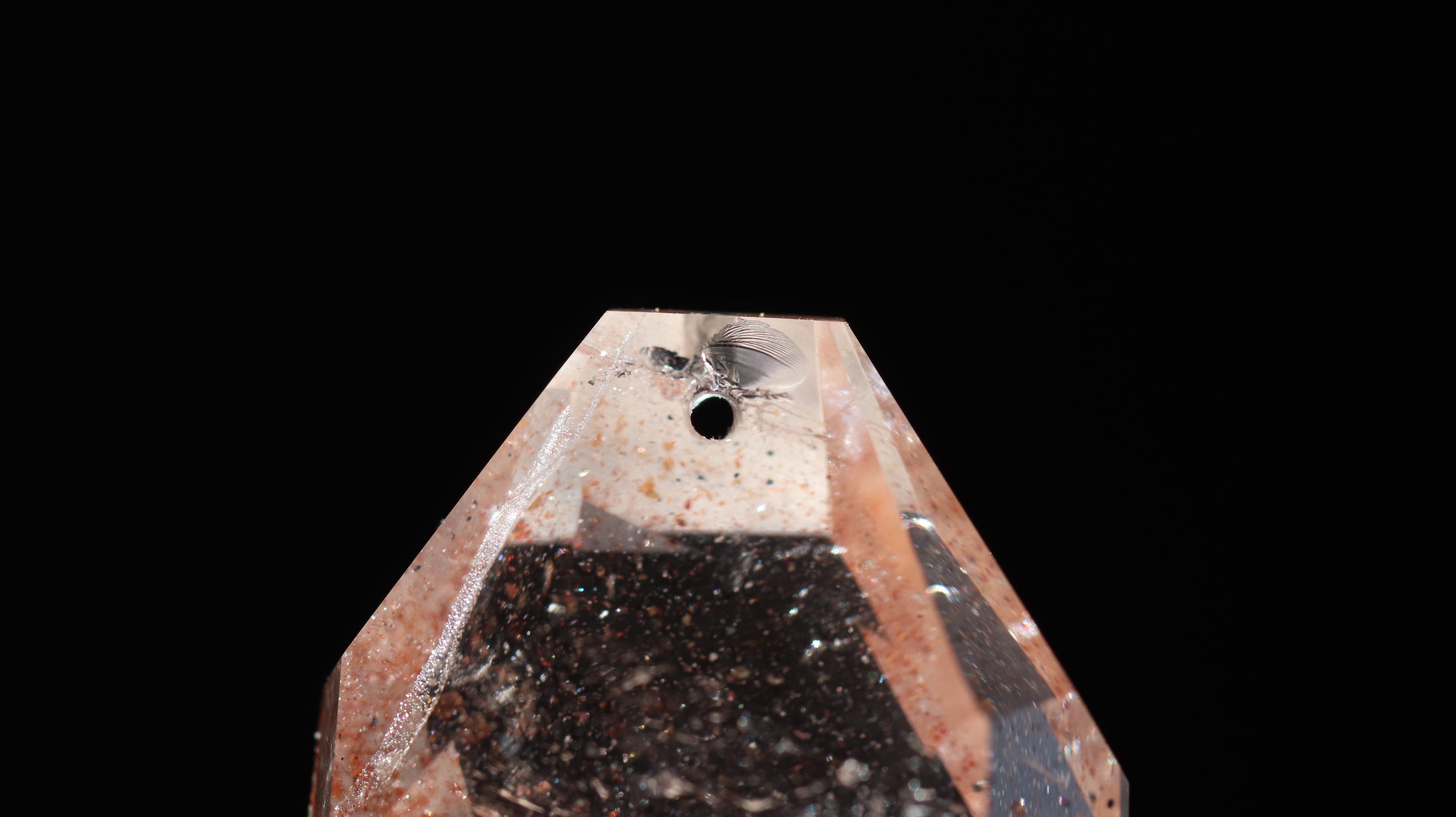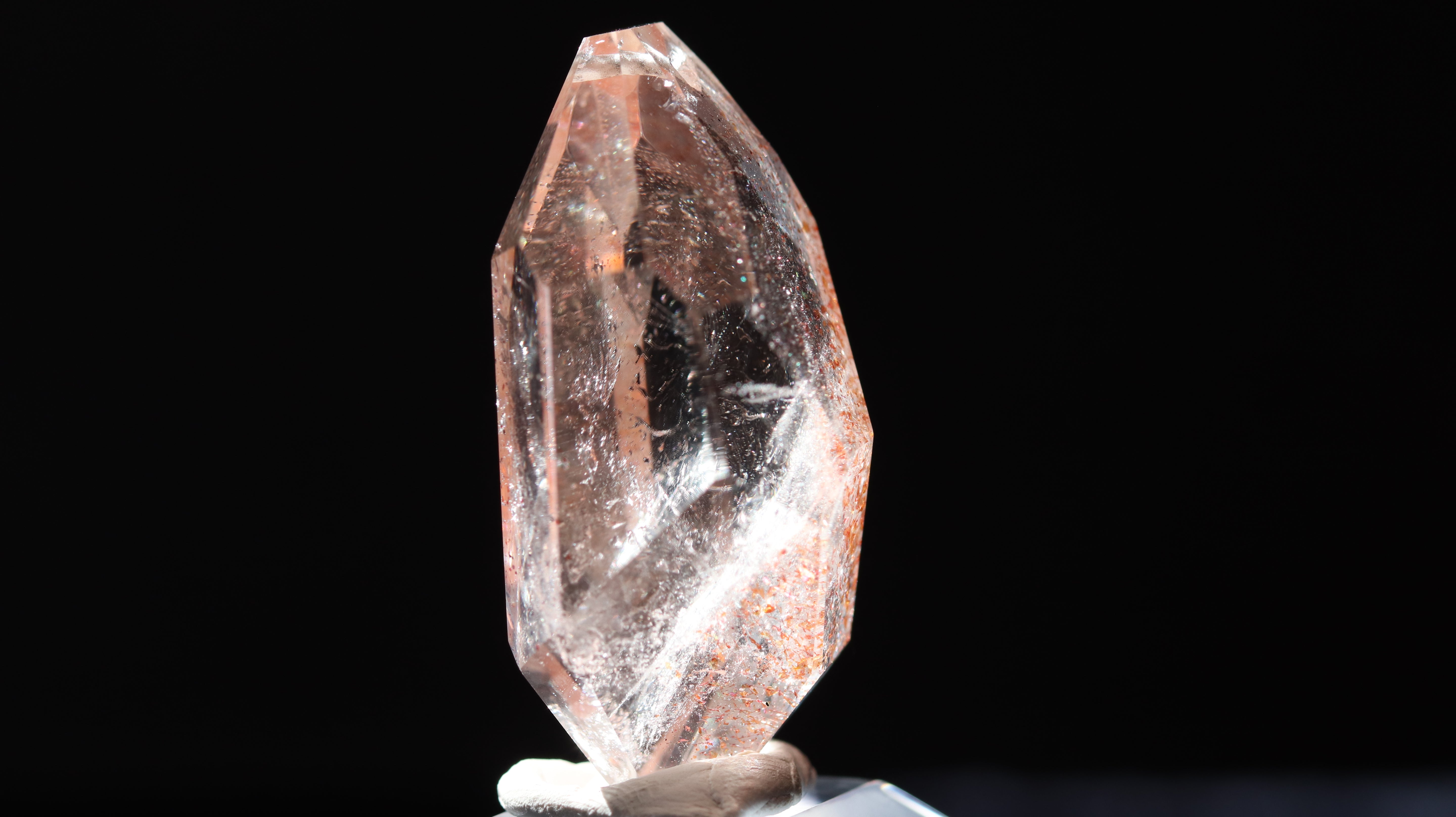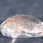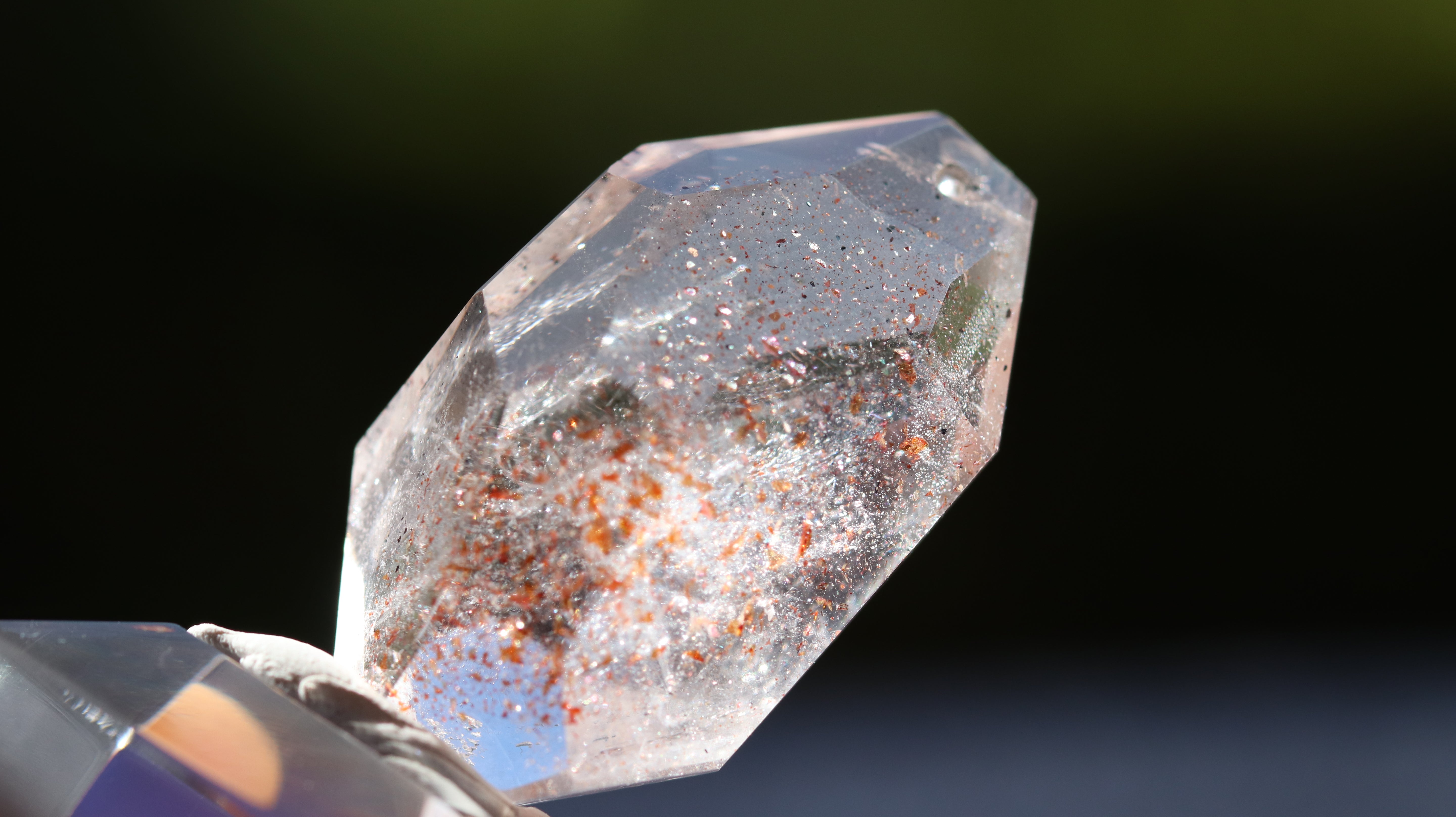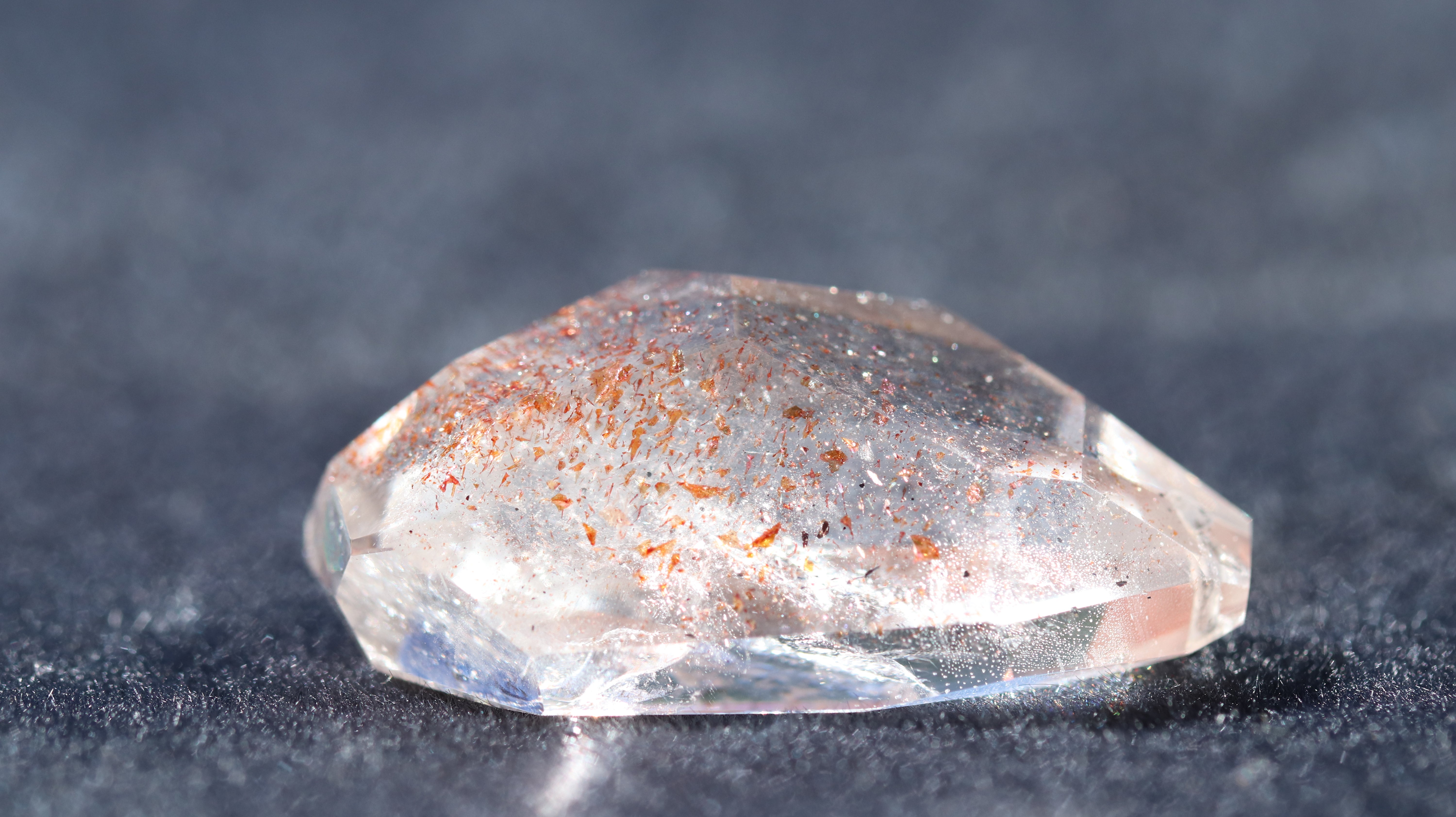 光を透過させると、多面カットの効果と相まって内部の赤い内包物が反射し、角度ごとに異なるきらめきを観察できます。