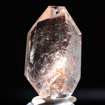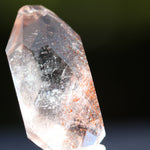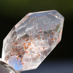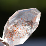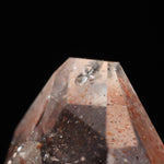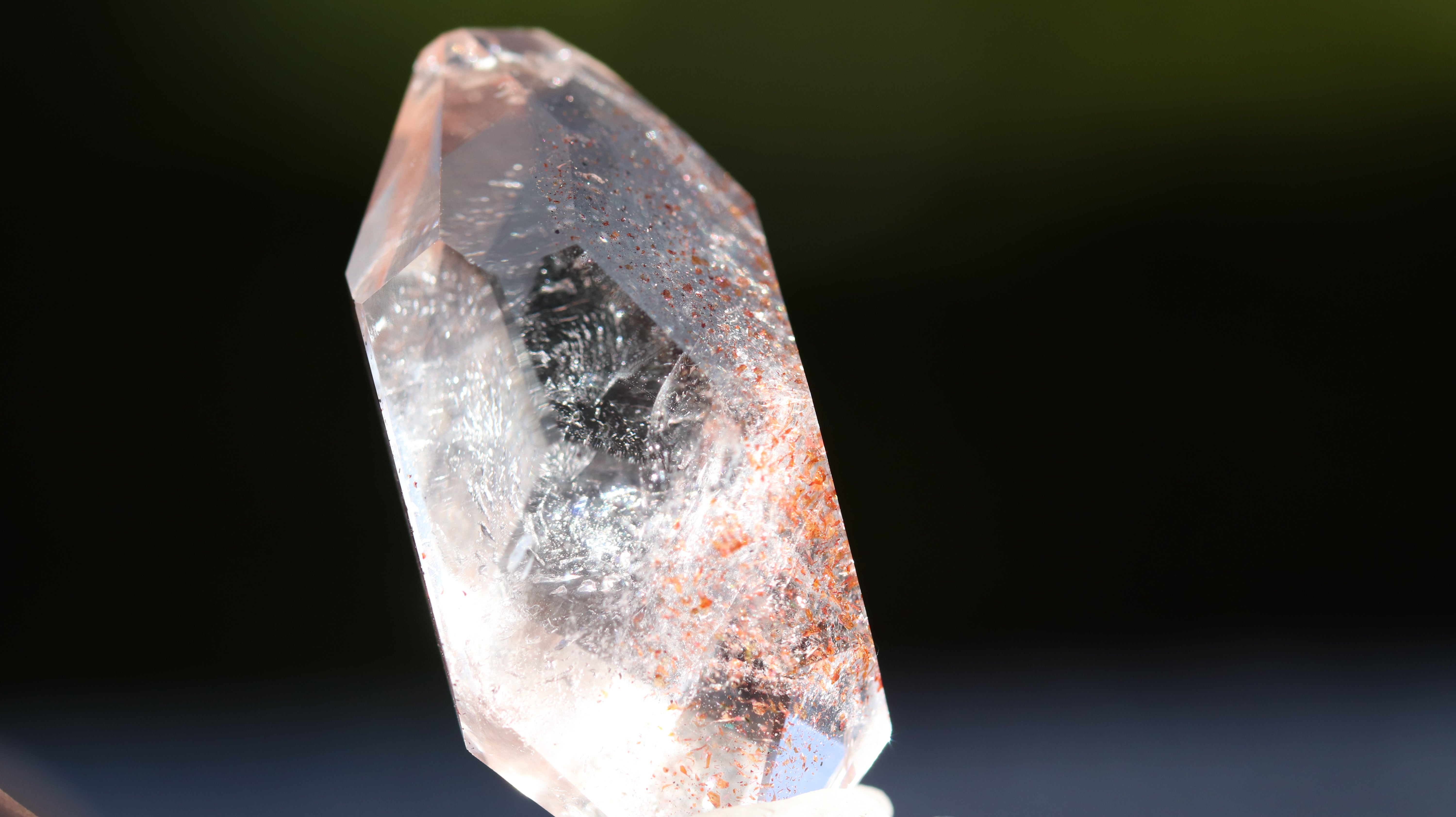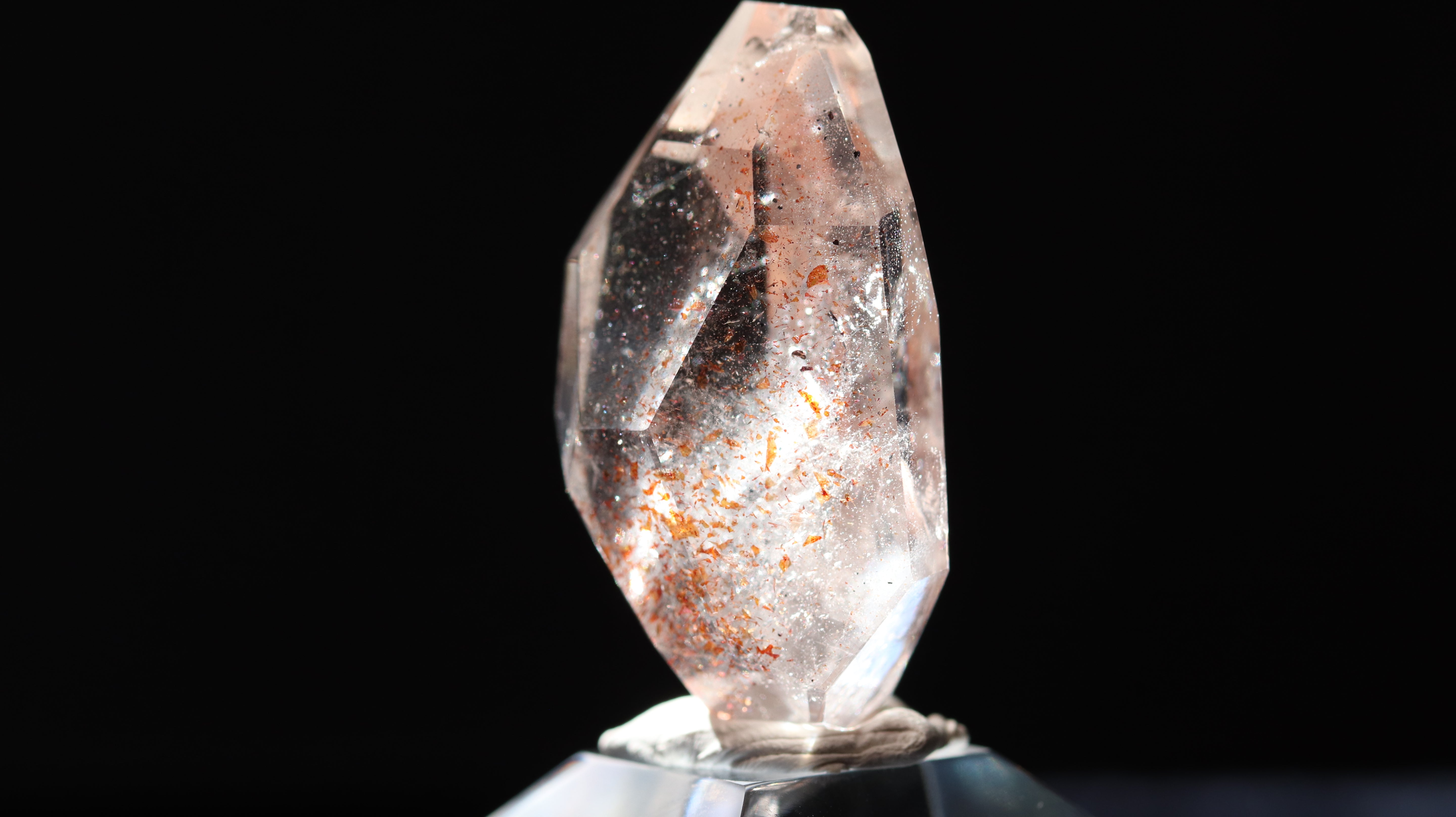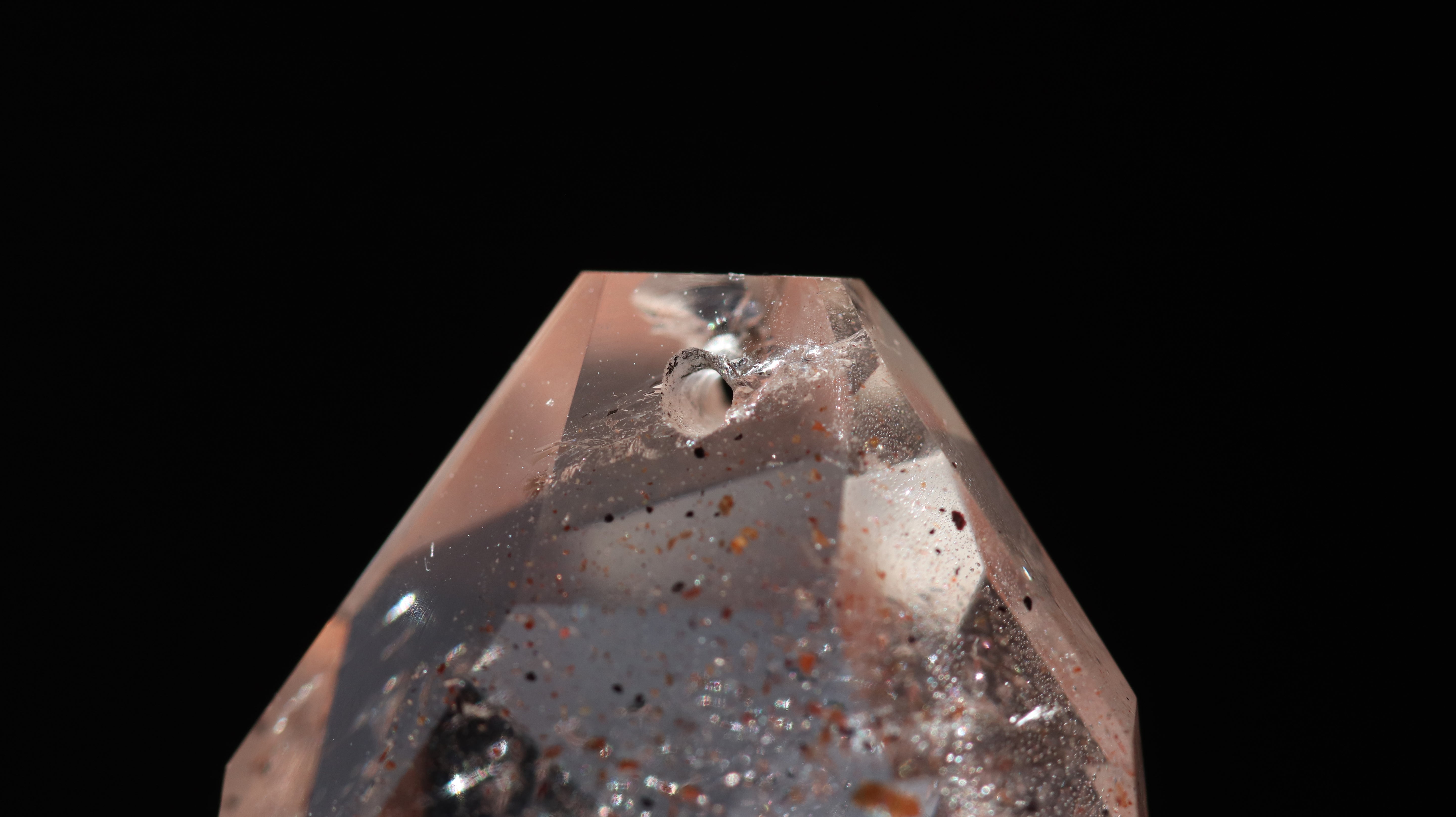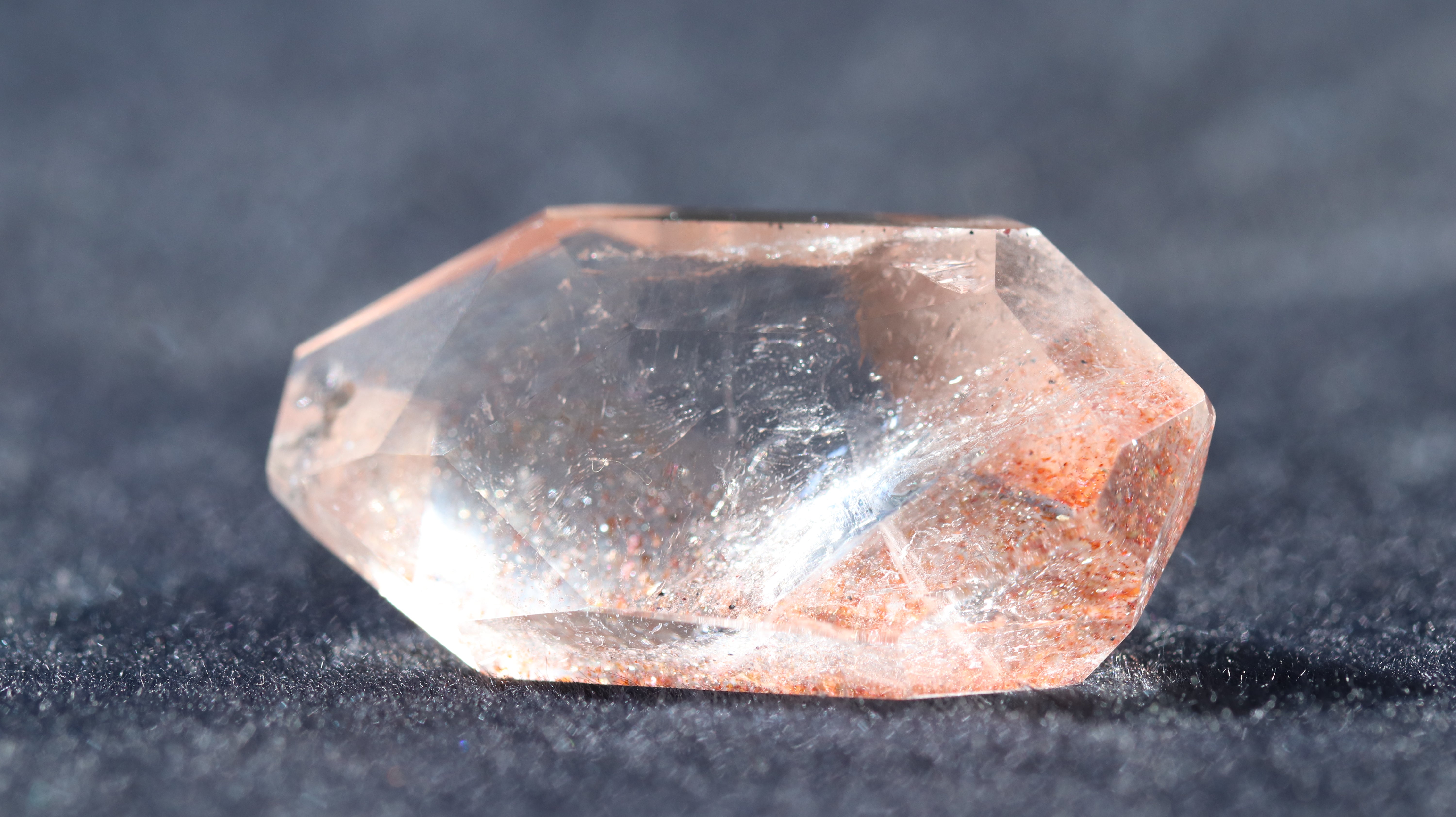 光を透過させると、多面カットの効果と相まって内部の赤い内包物が反射し、角度ごとに異なるきらめきを観察できます。