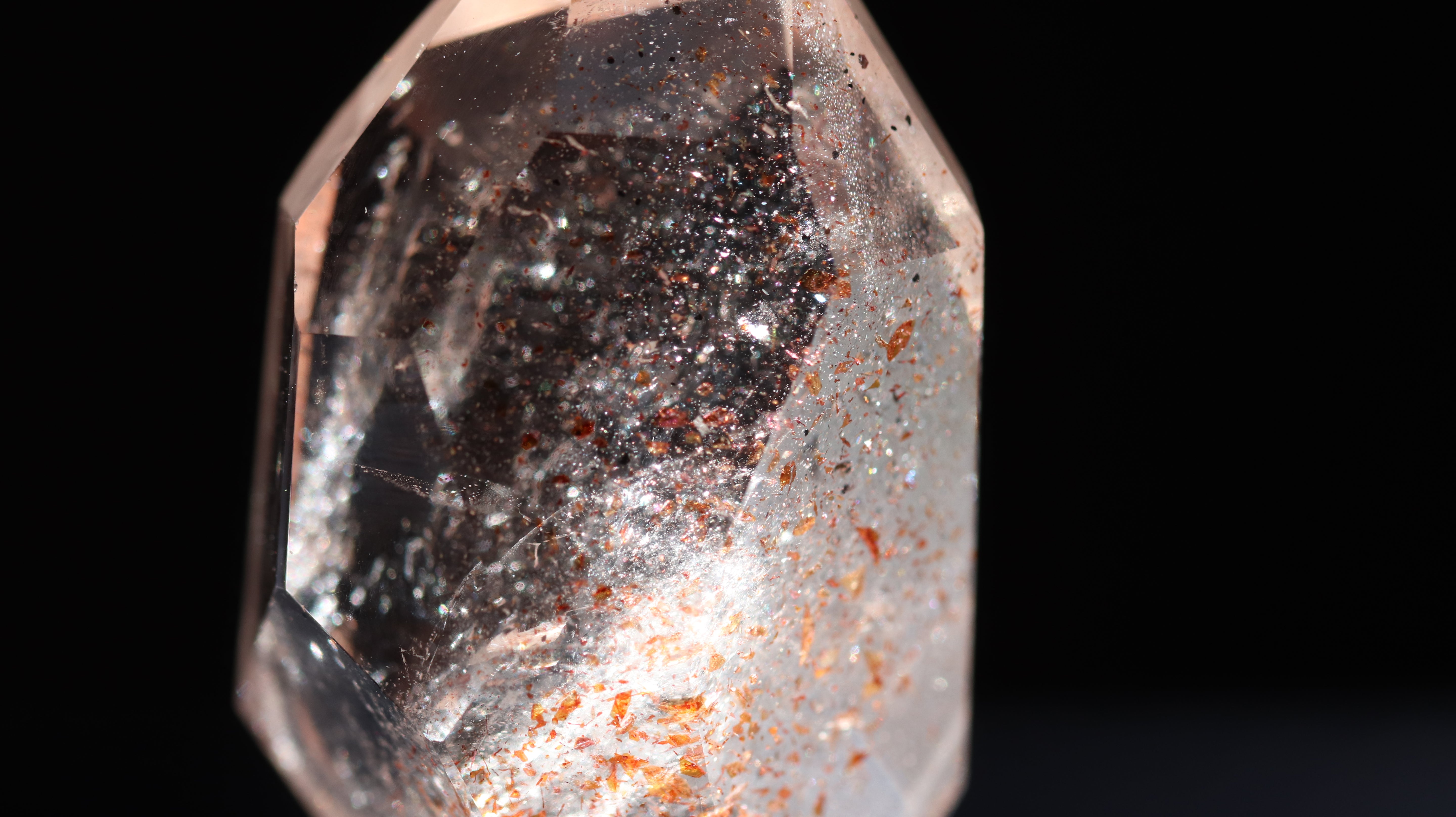結晶の一つひとつはごく小さな断片でありながら、集まることでまるで星雲のような立体的な輝きを見せるのが特徴です。鉱物インクルージョンの世界を深く楽しみたい方におすすめの一品です。