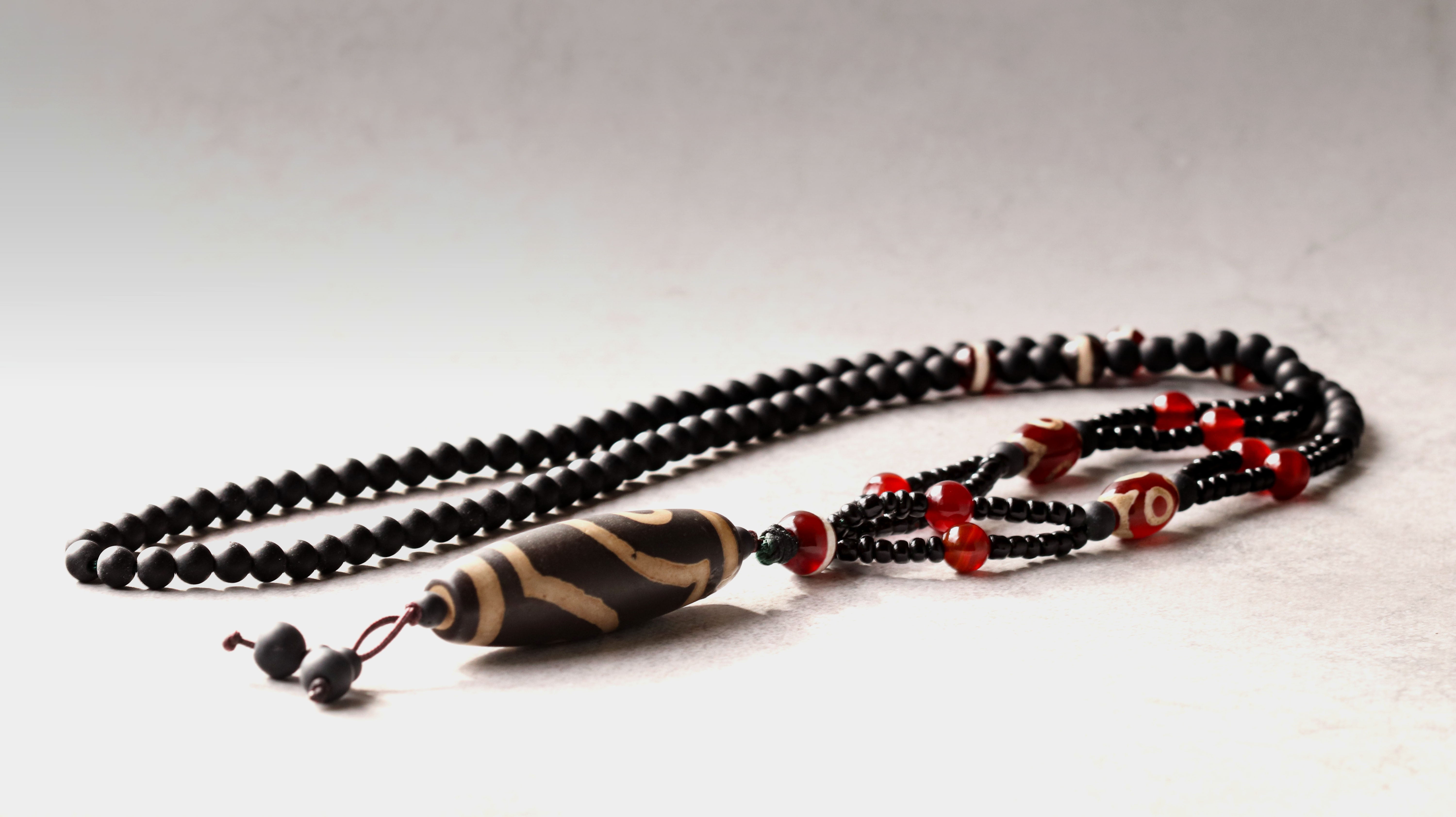 黒と赤の天然石がリズムよく配置され、天珠の神秘的な表情を引き立てています。